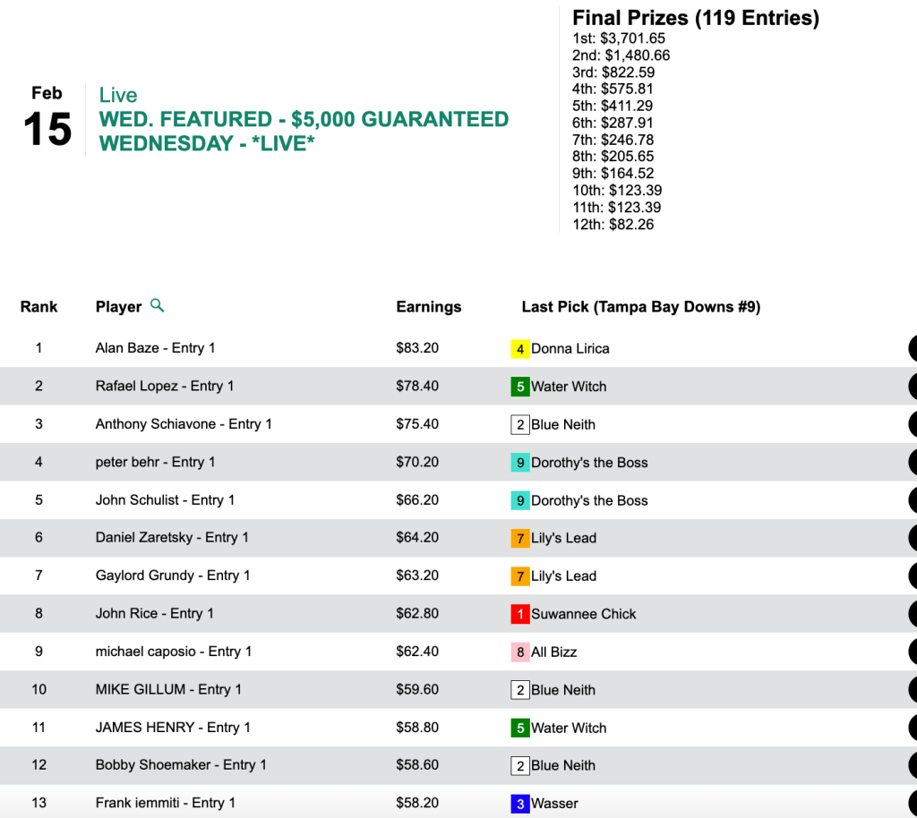 Money’s Worth helped Baze (4 firsts, 1 second) get his money’s worth in our $5,000 Gtd. No Limit tourney, which shut its doors with $8,225 in the kitty. The winner’s share came to $3,701.
