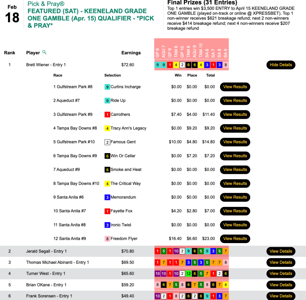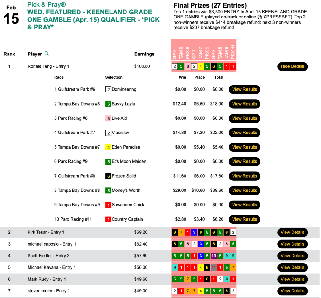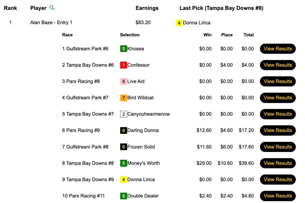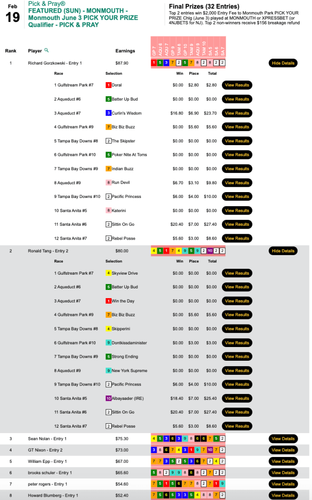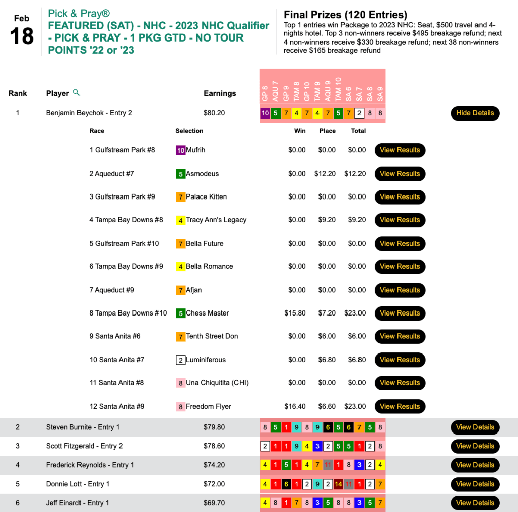This one, in the Low Ratio NHC qualifier at HorsePlayers, earned Zuer a spot in next month’s big dance. The winner was 2016 The BIG One champ Dan Flanigan, who booked 4 winners and another 4 runners up. Flanigan’s winners included the day’s biggest price—Greyzer ($22.20, $11.20) in the 9th at Tampa Bay Downs.