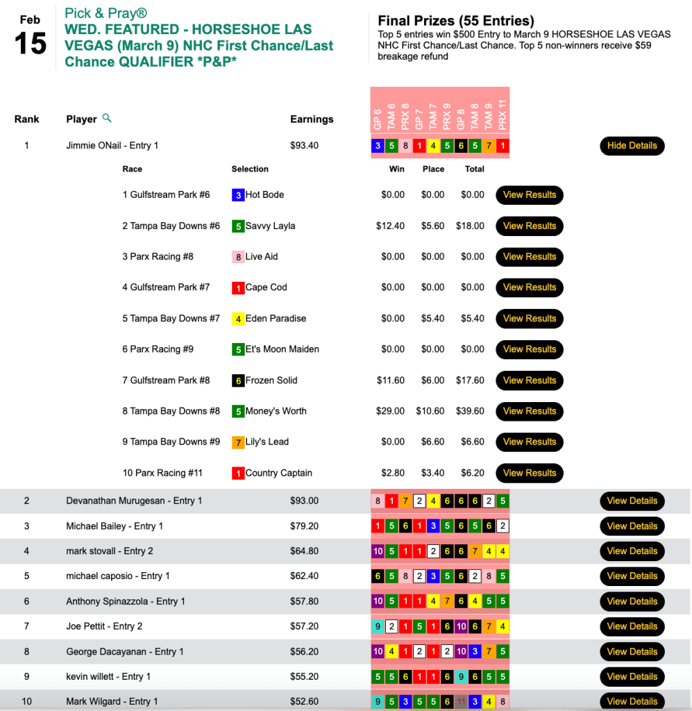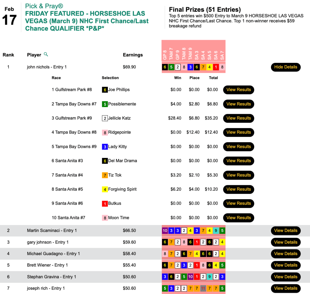 Friday’s top score was posted over at HorsePlayers in the $100 NHC qualifier that guaranteed one seat.