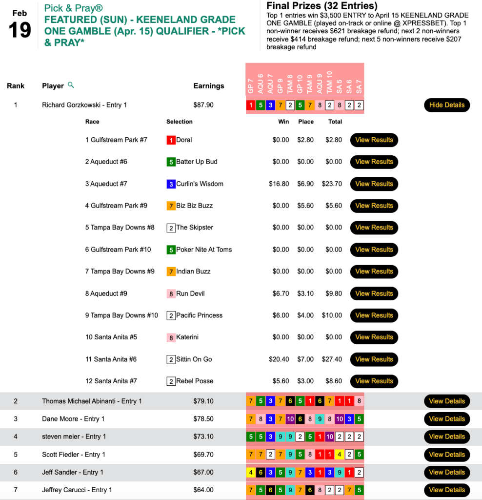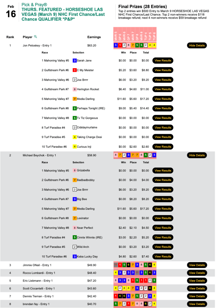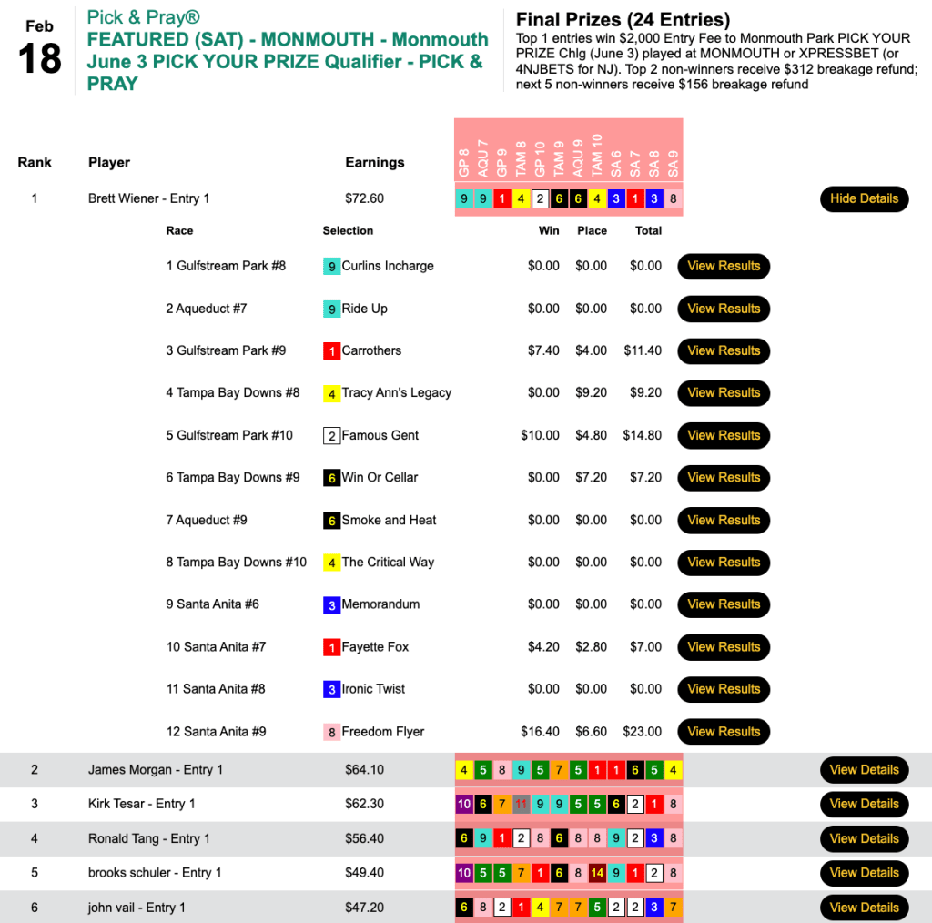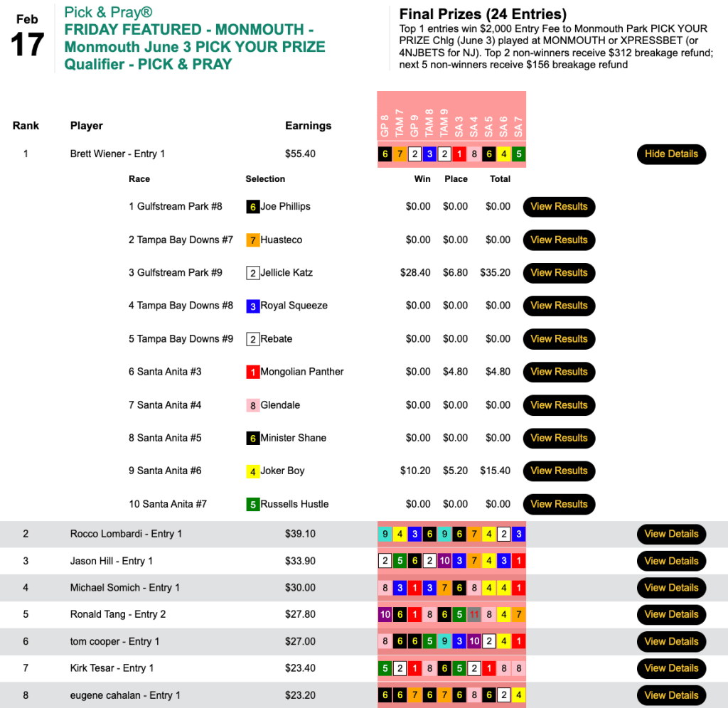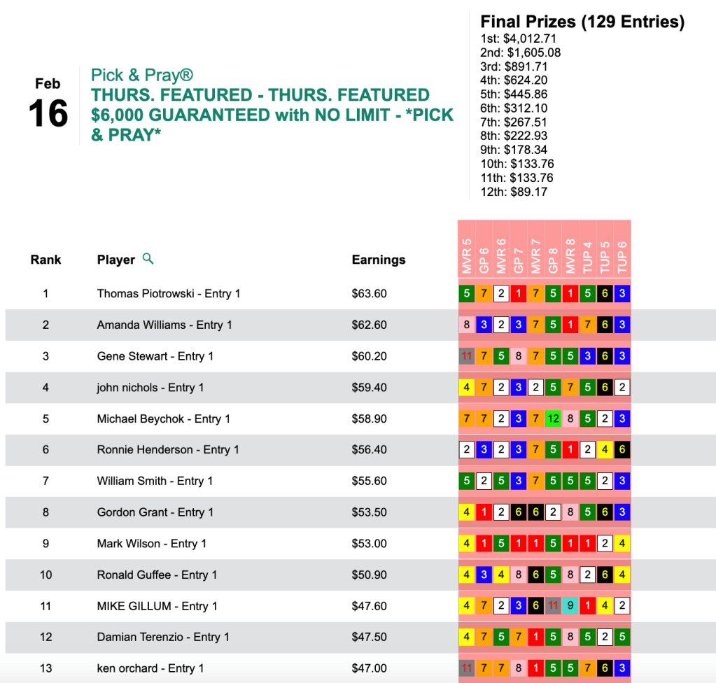 That horse plus 5 other winners and 1 runner up got Piotrowski the grand prize of $4,012 in Thursday’s $6,000 Guaranteed Pick & Pray, which closed with a purse of $8,917.