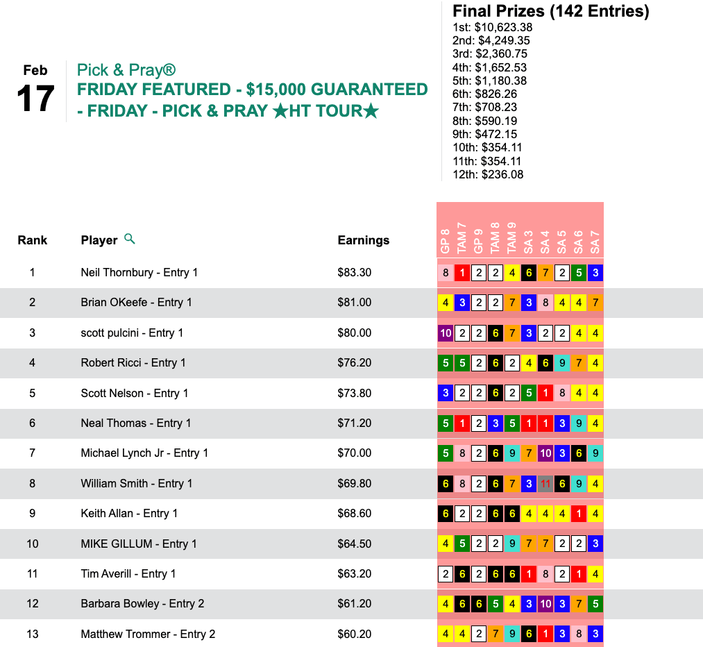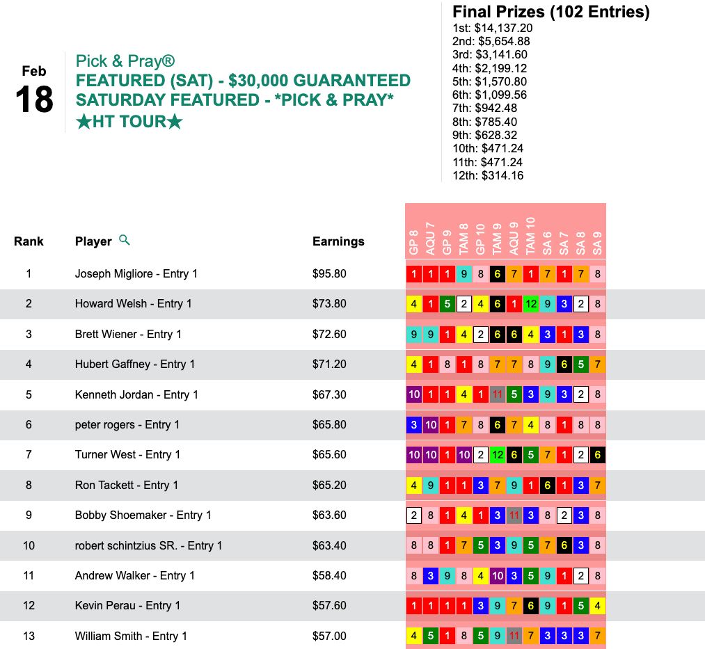 Wagner accounted for the day’s HT Tour showdown thanks to Greyzer plus 4 other winners. He raked in $12,698 in our $20,000 Guaranteed Pick & Pray, which closed up shop with a pot of $28,218.