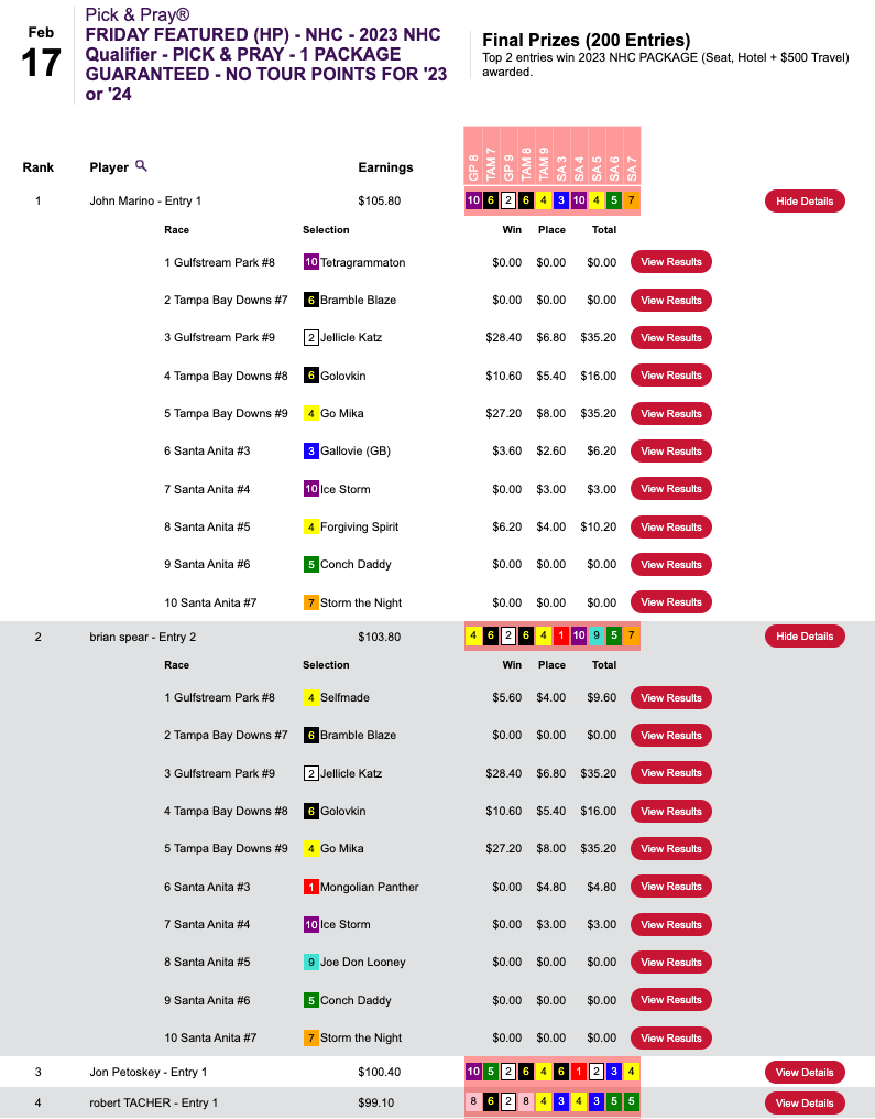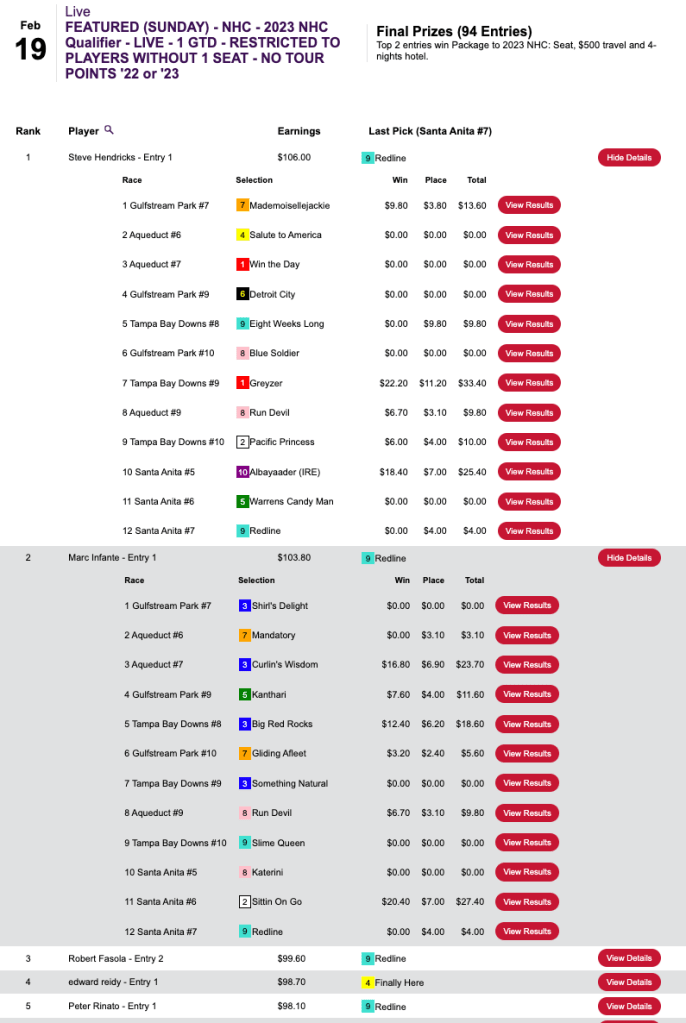 Last but not least, Steve Hendricks (5 wins, 2 places) and Marc Infante (6W, 2P) were the two seat winners in an NHC qualifier at HorsePlayers that was restricted to non-winners of a 2023 seat.