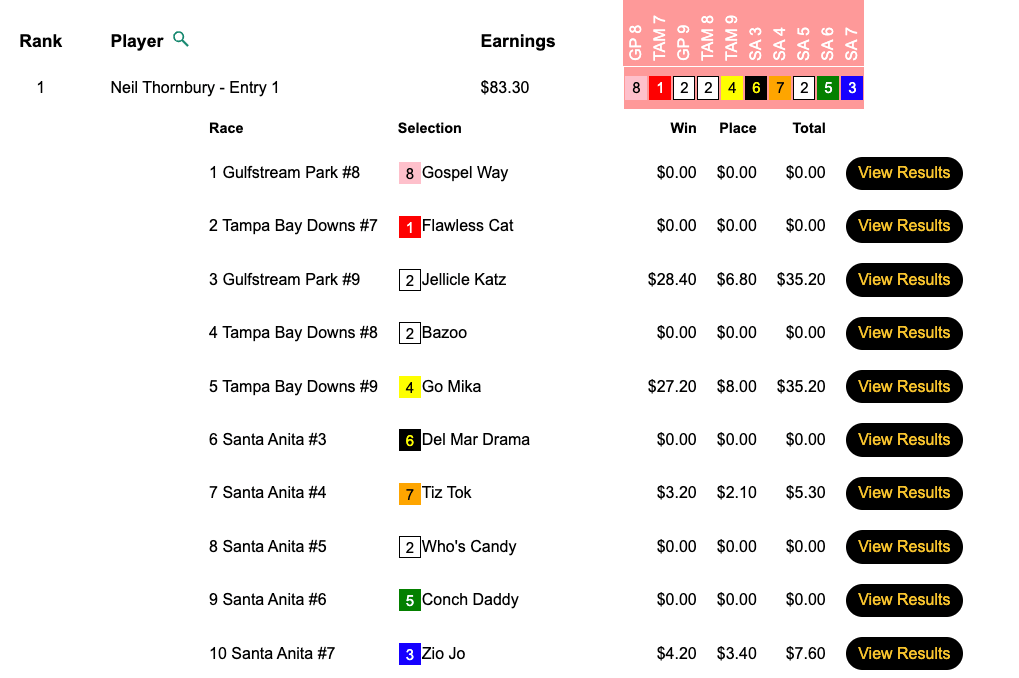 John Marino occupied the top spot with his 5 wins and 1 place. Happily for Brian Spear (4W, 2P), there were enough entries to give out a second seat. Marino and Spear each had the day’s two price horses, Jeillicle Katz and Go Mika.