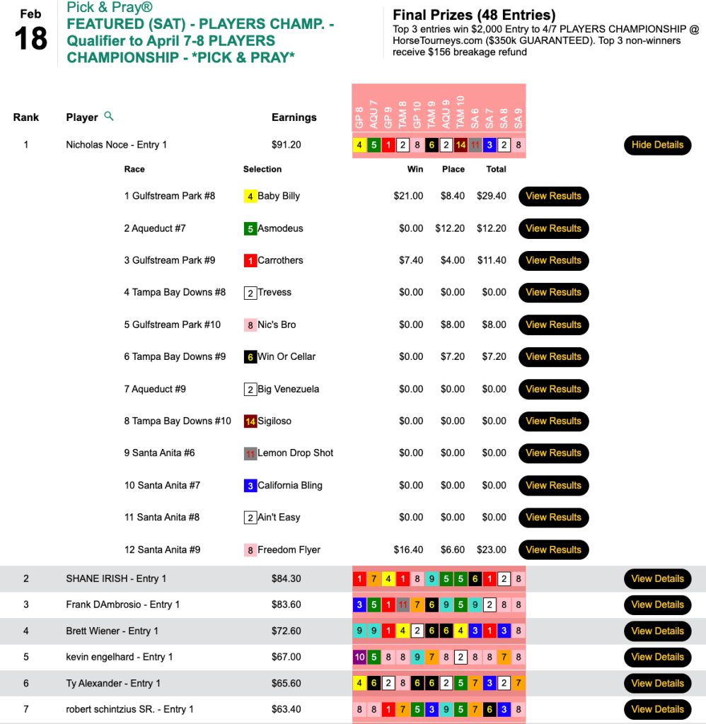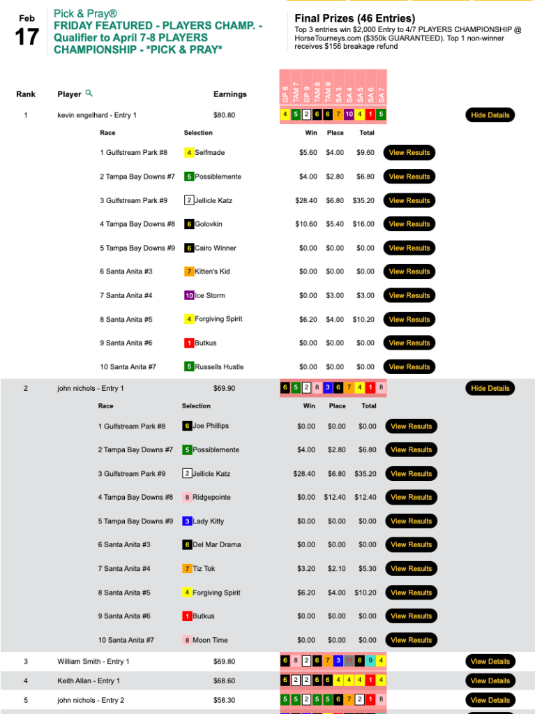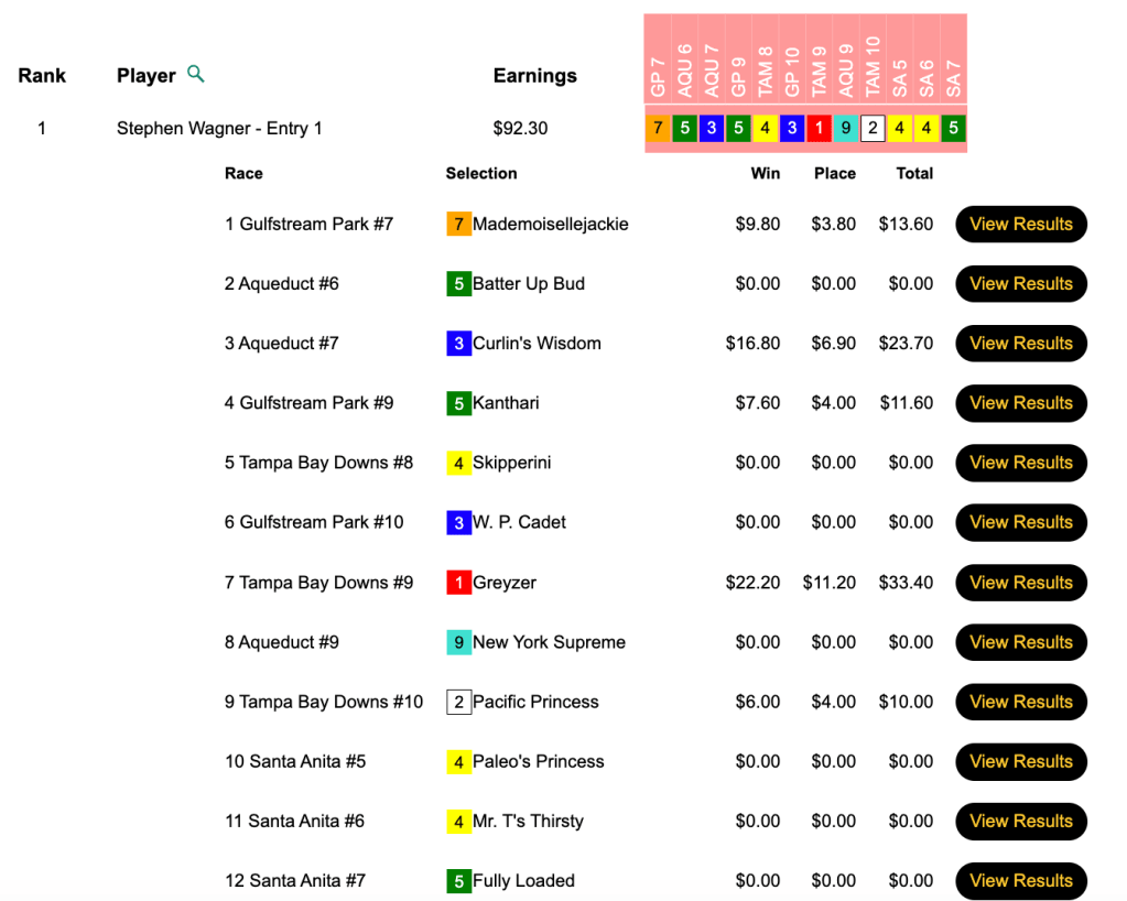 Nichols (4 wins, 1 place) finished second behind Kevin Engelhard (who had the first 4 winners en route to a 5-win, 1-place day) and 10 cents ahead of fellow seat winner “Battlin’” William Smith (3W, 2P). All three came up with Jellicle Katz ($28.40, $6.80) in the 9th at Gulfstream. Smith crossed into 3rd place (by just $1.20) and gained hope for the Players Championship thanks to a final-race, $7.20 place collection with Zihuatanejo.