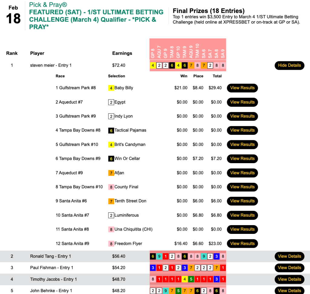 Meier’s latest conquest was our Saturday 1/ST Ultimate Betting Challenge qualifier. He brought this one home on the strength of 2 wins and 3 places, with those winners being bookend tallies by Baby Billy and Freedom Flyer.