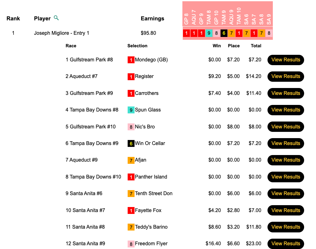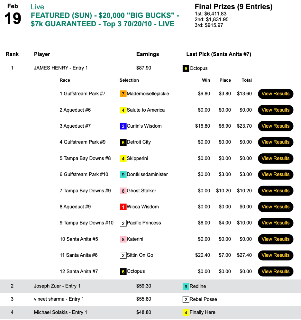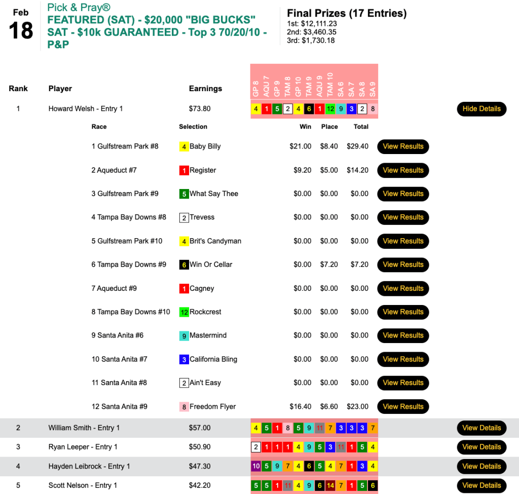 Welsh picked up $12,111 for his 3 firsts and 1 second, which included Baby Billy ($21.00, $8.40) in the the first contest race (the 8th at Gulfstream) and Freedom Flyer ($16.40, $6.60) in the final contest race (the 9th at Santa Anita). The final overall pot here came to $17,301. And Welsh’s Saturday winnings totaled $17,765.