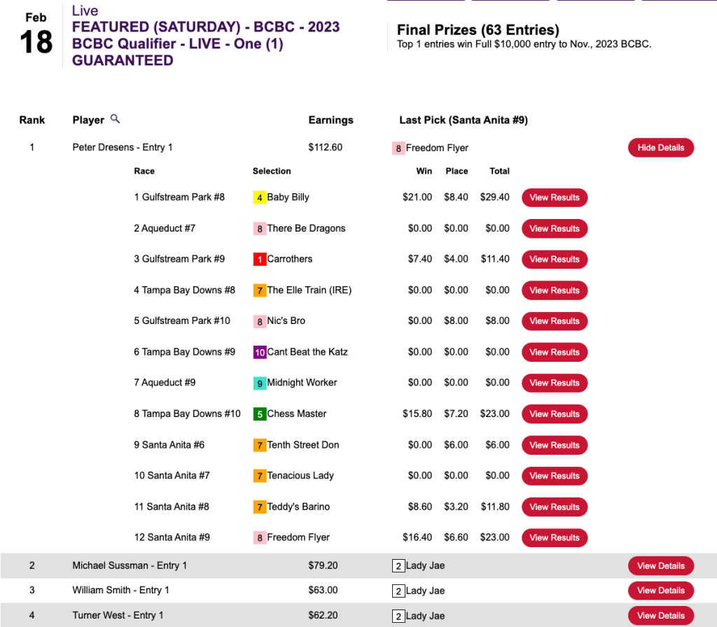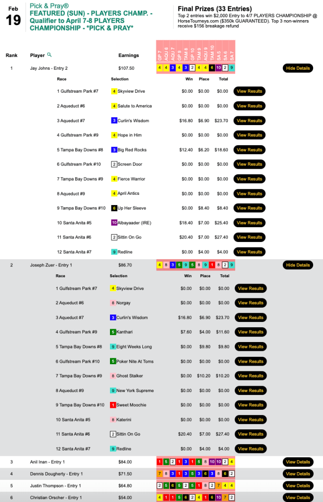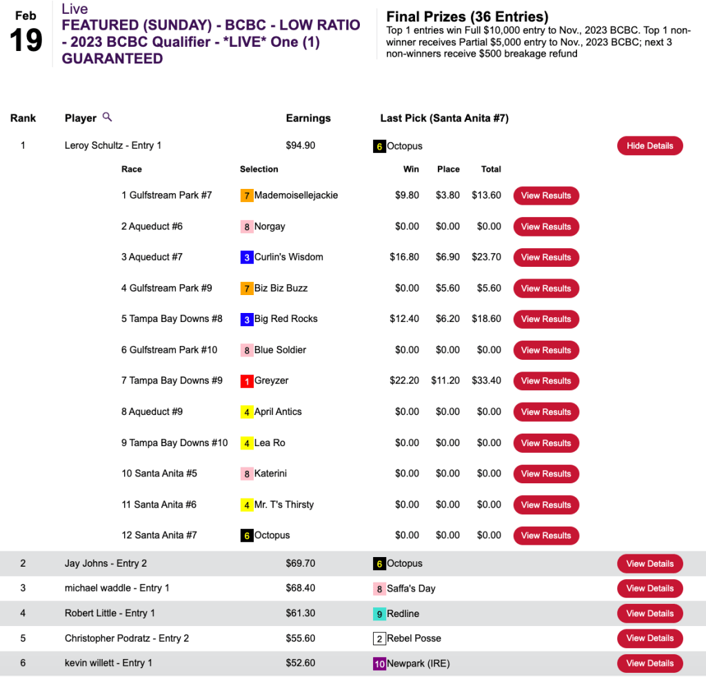 It wasn’t what he was hoping for, but Johns collected a $5,000 Rooty Tooty Fresh ‘N Fruity partial Breeders’ Cup Betting Challenge spot for finishing second to Leroy Schultz in Sunday’s Low Ratio qualifier at HorsePlayers. Schultz’s top return among 4 wins and a place came with 10-1 Greyzer.
