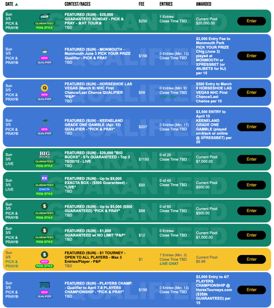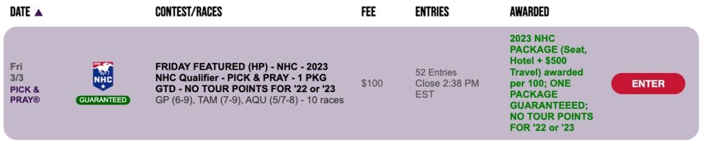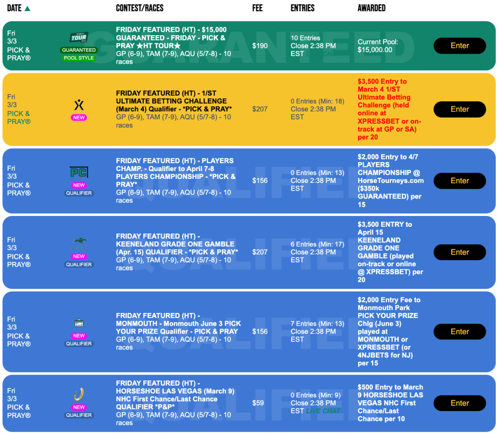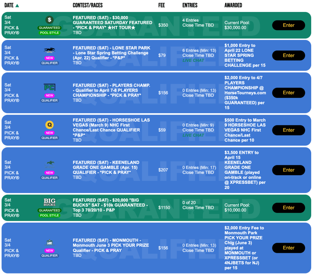 As mentioned earlier, there will again be Pick & Pray qualifiers on Saturday for the March 9 NHC First Chance/Last Chance tournament ($59 entry fee), the April 7-8 Players Championship ($156), the April 15 Keeneland Grade One Gamble ($207) and the June 3 Monmouth Pick Your Prize Challenge ($156). The price points and winning ratios for each are the same as those in place for Friday.