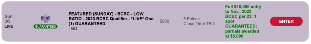 Both of these final NHC qualifiers are $500, Low Ratio skirmishes with winning ratios of 1-per-21. One is open to all, and the other is restricted to those without one 2023 NHC seat. Note that each of these Low Ratio NHC games require at least 10 entrants in order for the tourney to go forward.