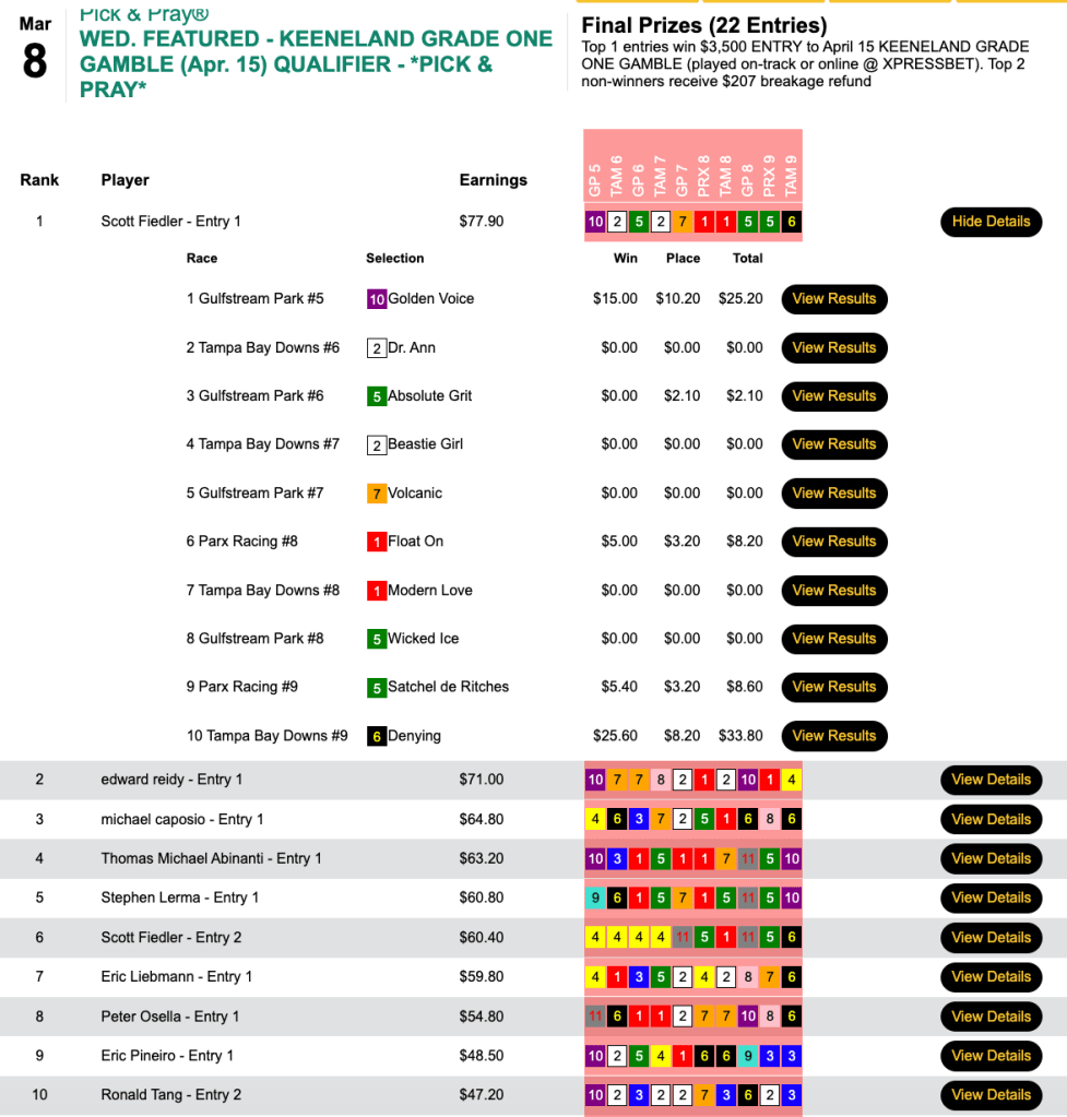 Fiedler will now have action on April 15 in the Keeneland Grade One Gamble. He can play his $3,500 entry either on-track or at Xpressbet.