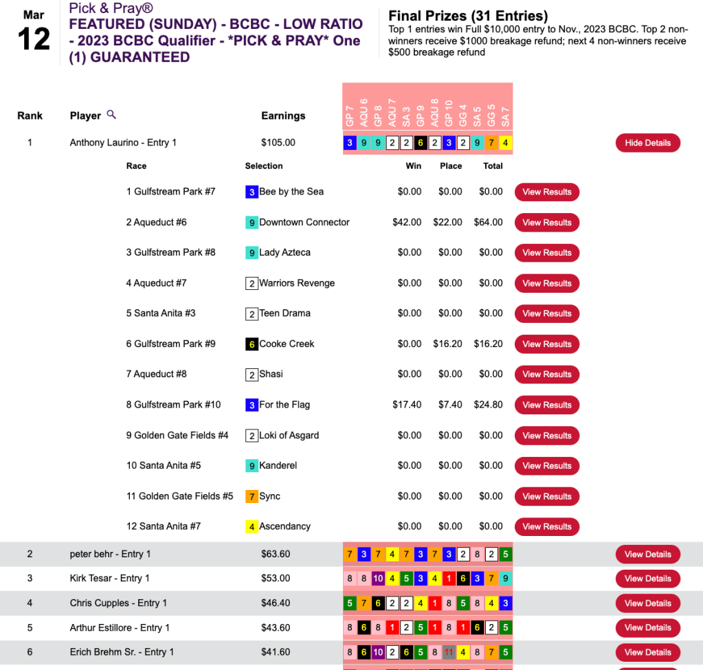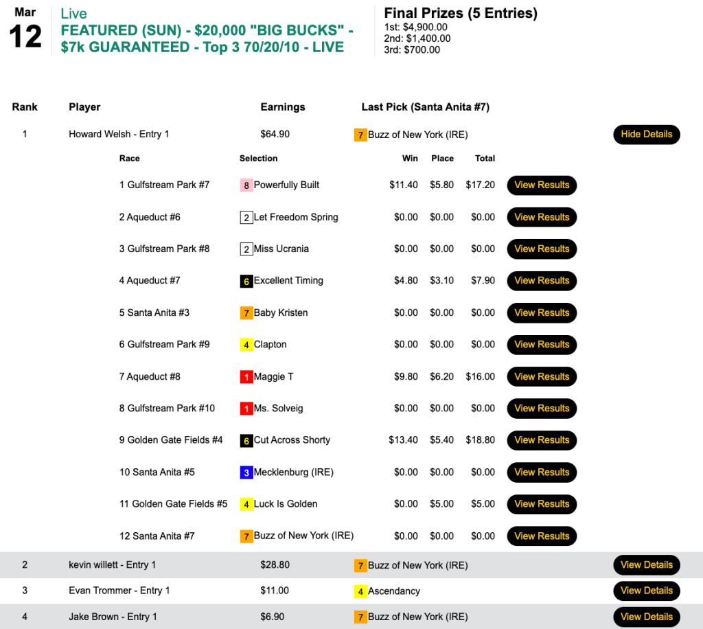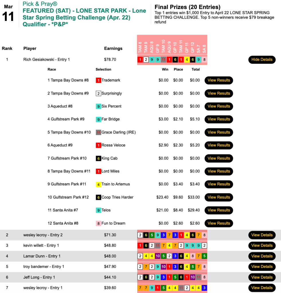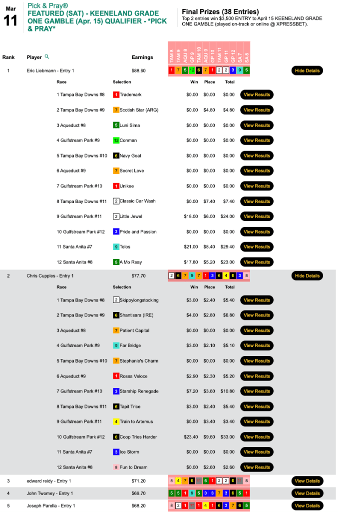 Happily for runner up John Twomey, there were enough entries to award a second $3,500 seat. Twomey did all his scoring (3 winners) over the first four contest races.