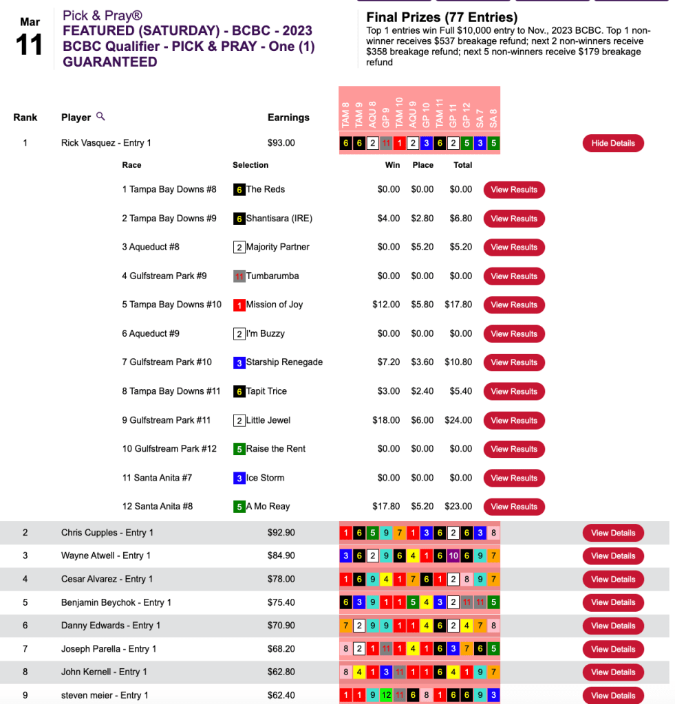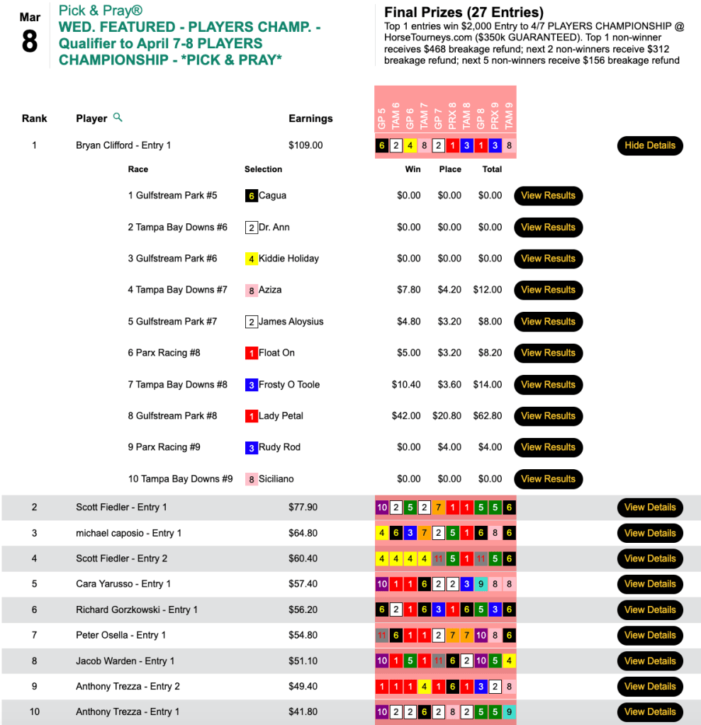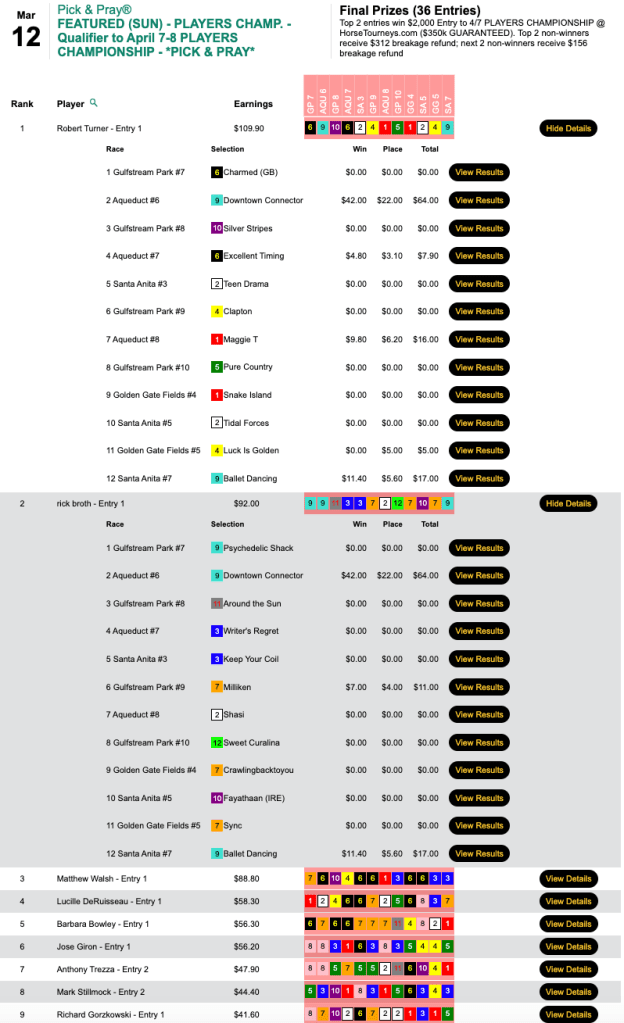Happily for runner up John Twomey, there were enough entries to award a second $3,500 seat. Twomey did all his scoring (3 winners) over the first four contest races.