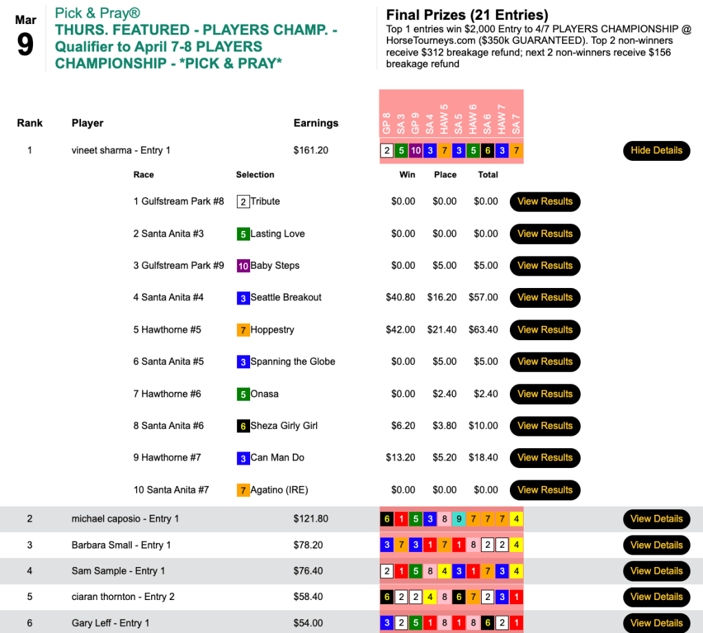 Vineet “Please don’t squeeze the” Sharma (4 wins, 2 places) scored with a pair of $40+ horses, including Hoppestry ($67.60, $21.40) in the 5th at Hawthorne en route to a victory worth $2,955 in Thursday’s $6,000 Guaranteed Pick & Pray, which closed its doors with $6,566 in the kitty.