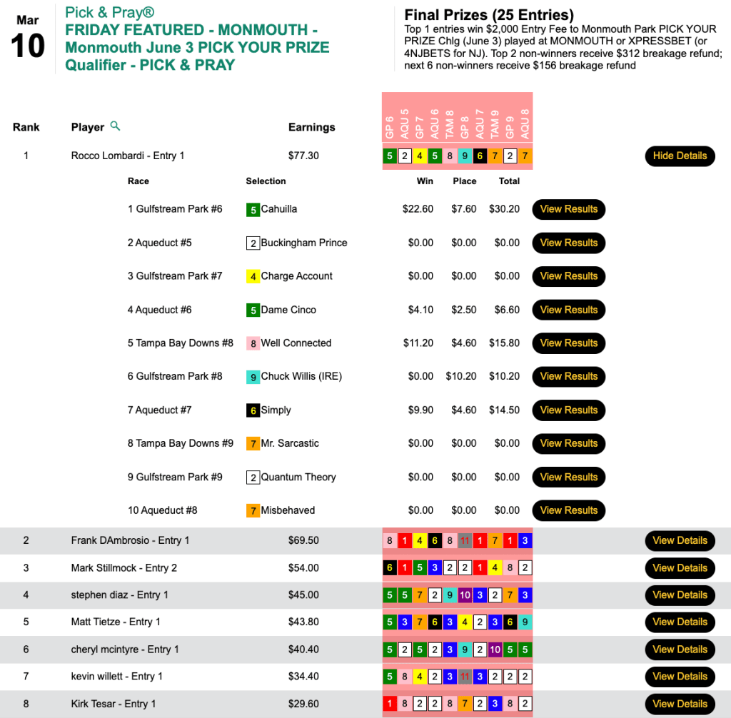 On Friday, we hosted the week’s first Monmouth Pick Your Prize Challenge qualifier. It was captured by Rocco Lombardi, thanks to 4 wins and a place.