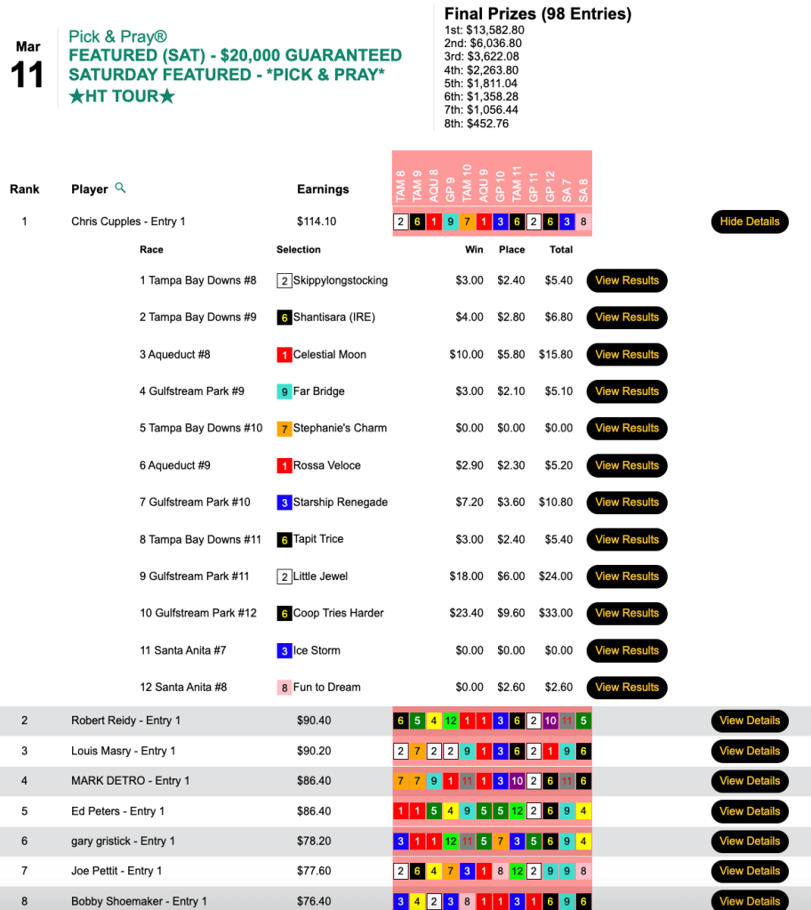 Here, as if guided by a higher power, Cupples picked 9 winners out of the first 10 races, and he won $13,582 in an HT Tour event ultimately worth a total of $30,184. We bet Emma’s going to get something nice out of this deal.