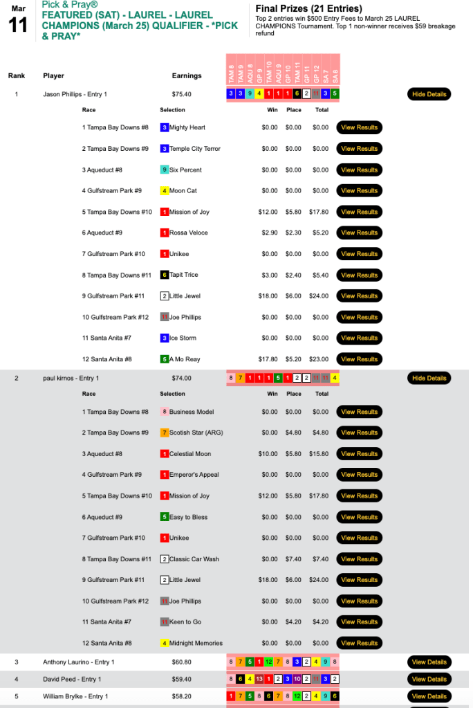 The $500 seat winners were the two to scale $70—Jason Phillips (5 wins, 0 places) and Paul Kimos (3W, 3P). Little Jewel ($18.00, $6.00) in the 11th at Gulfstream was a winner that each of them had. Phillips had A Mo Reay, which allowed him to leapfrog all the way to the top.