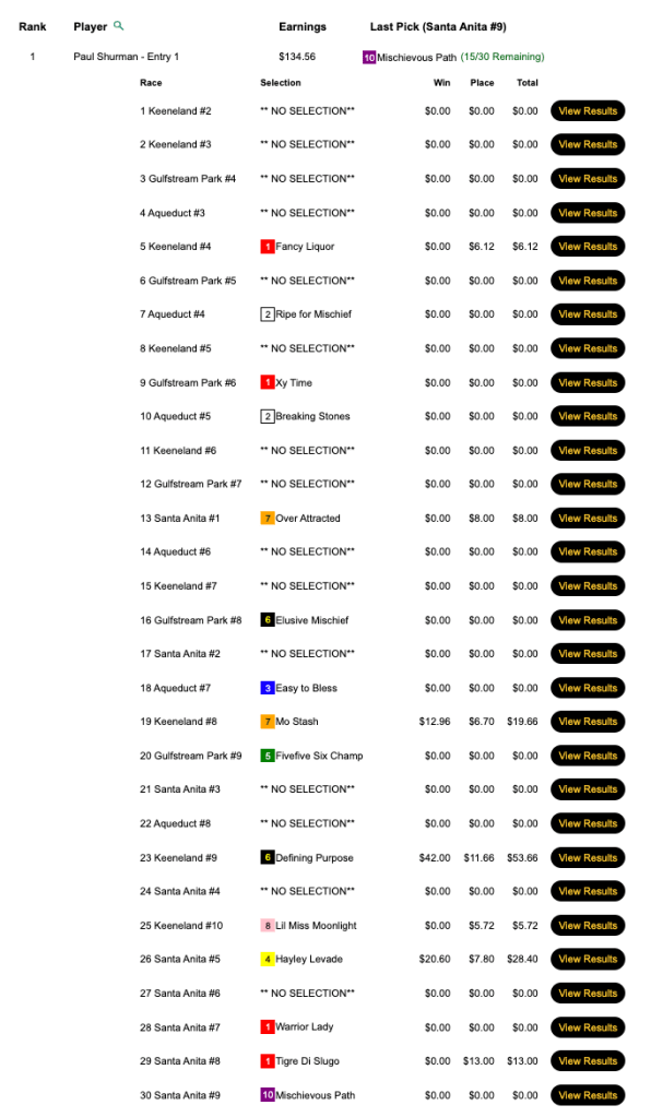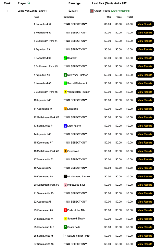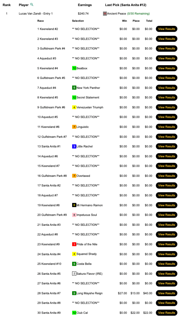 Here’s what was easy to overlook amid all that shaking up at the top: Lucas Van Zandt used his first two picks of the day on Here Mi Song and One Flew South. In the space of four plays covering just six contest races (the final three on Friday and the first three on Saturday), Van Zandt’s score had gone from $0.00 to $152.14, and his place in the standings had skyrocketed from dead last to 6th!