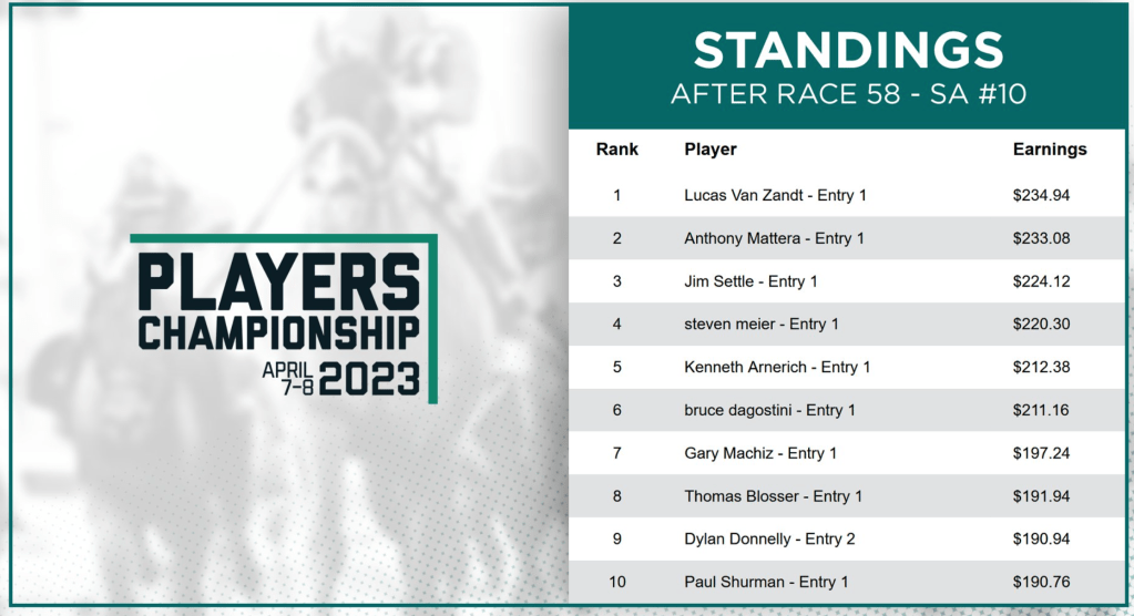 Special kudos to the others who finished in the Players Championship top 10: Jim Settle (3rd place, $30,618), Steven Meier (4th, $22,964…and 13th with his other entry!); one-time leader Bruce D’Agostini (5th, $19,136), Kenneth Arnerich (6th, $17,223), Gary Machiz (7th, $15,309), Thomas Blosser (8th, $13,395), Paul Shurman (9th, $9,568) and Dylan Donnelly (10th, $7,655). Here is the full list of those finishing in the money:
