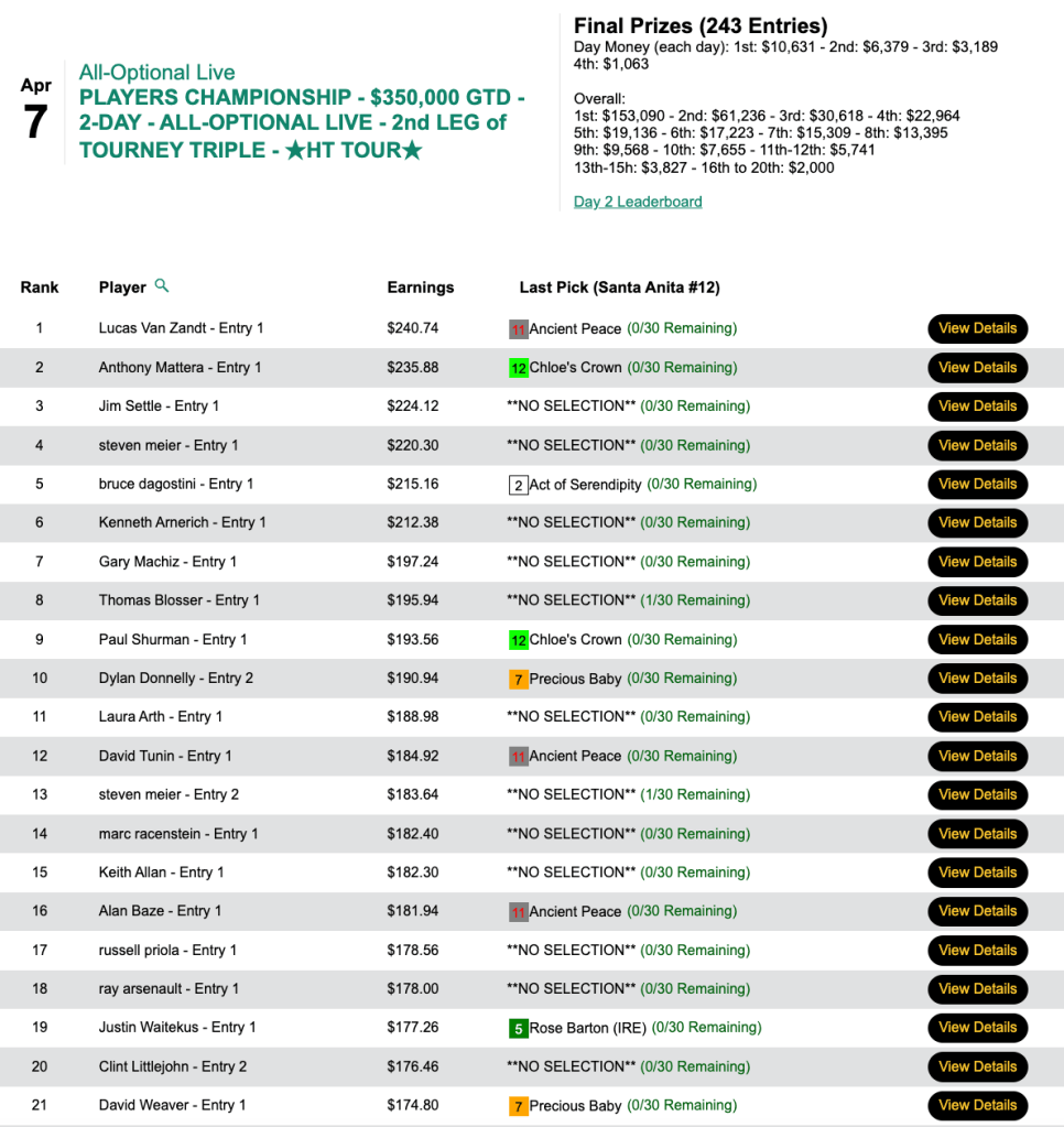 The middle leg of the 2023 Tourney Triple series attracted 243 entries, and it required players to make 15 daily plays from among 30 eligible races each day at Aqueduct, Gulfstream, Keeneland and Santa Anita.