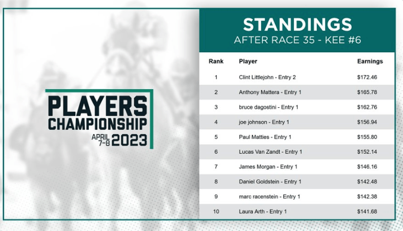When Elm Drive reported home first, it looked to all the world—including Bill Downes and Chris Larmey on the HorseTourneys live YouTube webcast—like there would be a new leader. Unfortunately for Mattera, however, Elm Drive dropped all the way down to 7-1 in the last flash, and his parimutuel returns were “only” $17.20 to win and $8.80 to place. Van Zandt was still in front by $1.86.