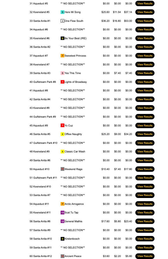 “I love finding bombs…but I love “pass” races too,” he said. “In a contest like the Players Championship, you need to not play 15 races, so figuring out which ones those are has value too. In fact, I try not to even watch the “pass” races just so they don’t get into my brain. Once I figure out the 15 horses I AM going to play, I’ll enter those selections at the beginning of the day, and, typically, I won’t change them unless the odds are too low or something unexpected happens.”