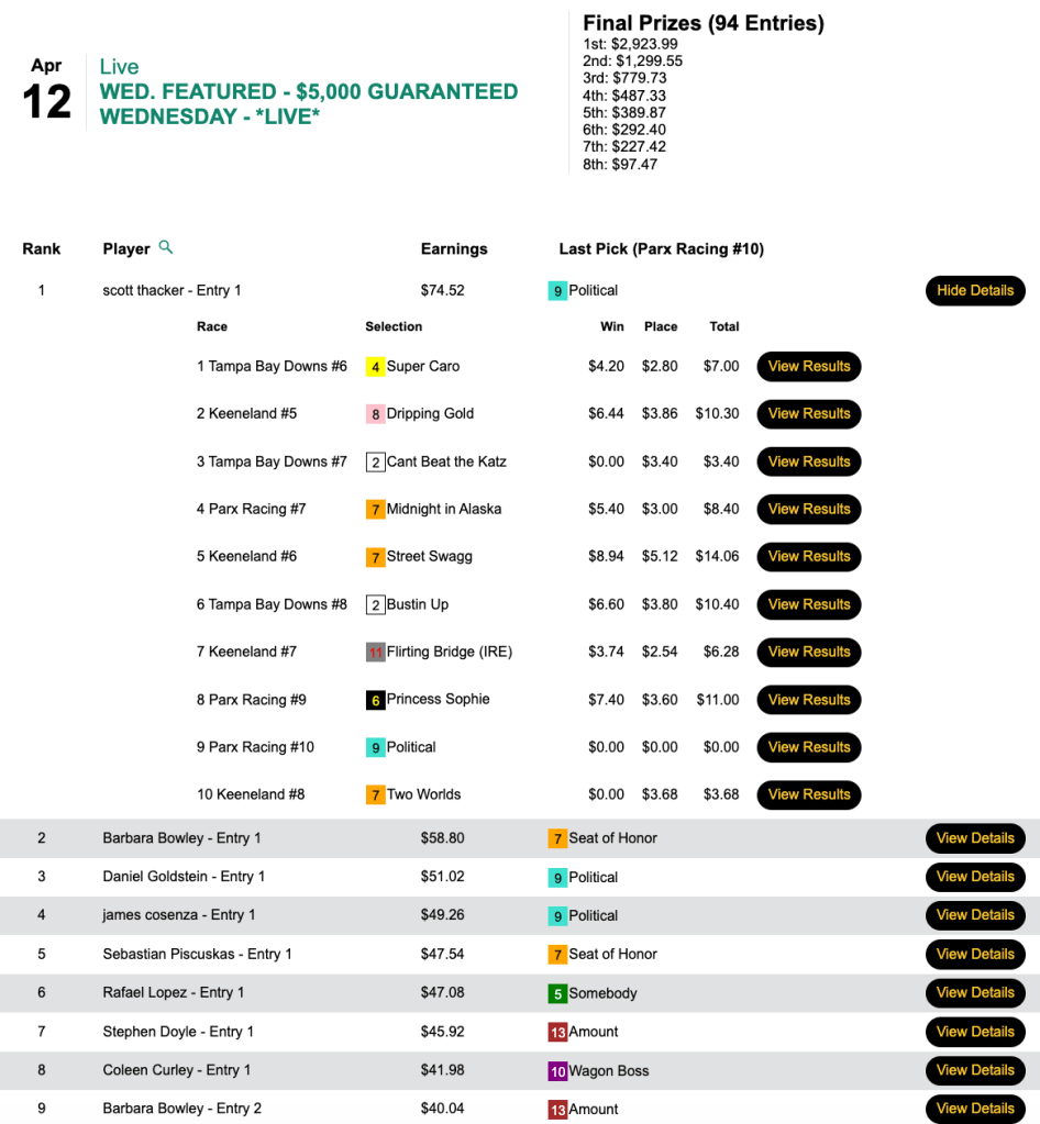 Scott Thacker had that winner plus 6 others—and a place collection on top of that. His 7 firsts and 2 seconds from 10 races earned him $2,923 in Wednesday’s $5,000 Guaranteed cash game, which closed its doors with $6,497 in the till.