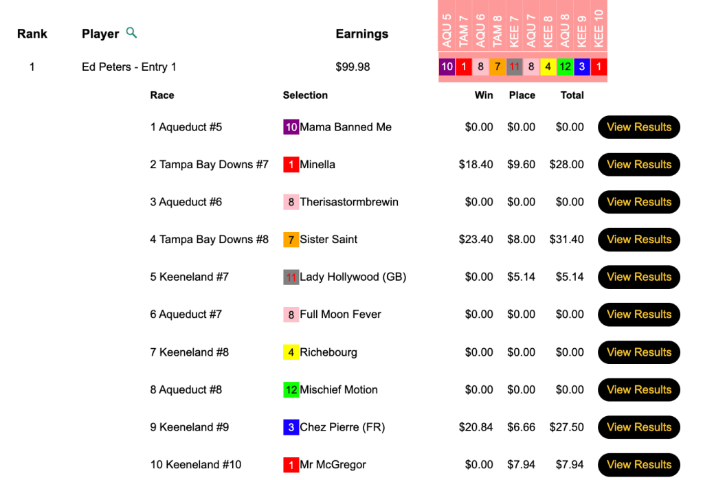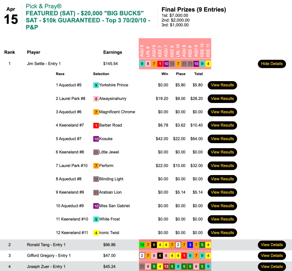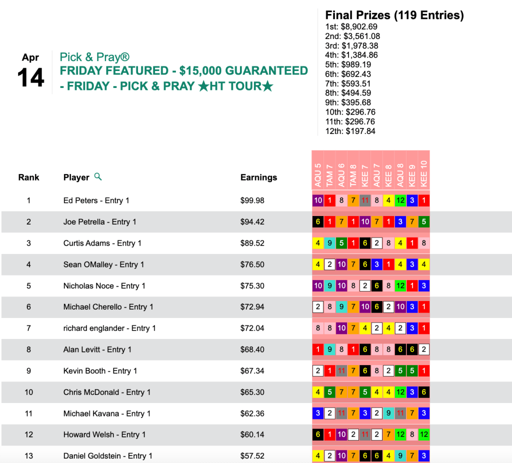 The Maker’s Mark Mile upsetter of Modern Games was one of 3 winners that paired nicely with 2 runners up for Peters, who collected $8,902 for triumphing in Friday’s HT Tour battle, our $15,000 Guaranteed Pick & Pray, which finished up with a purse of $19,783.
