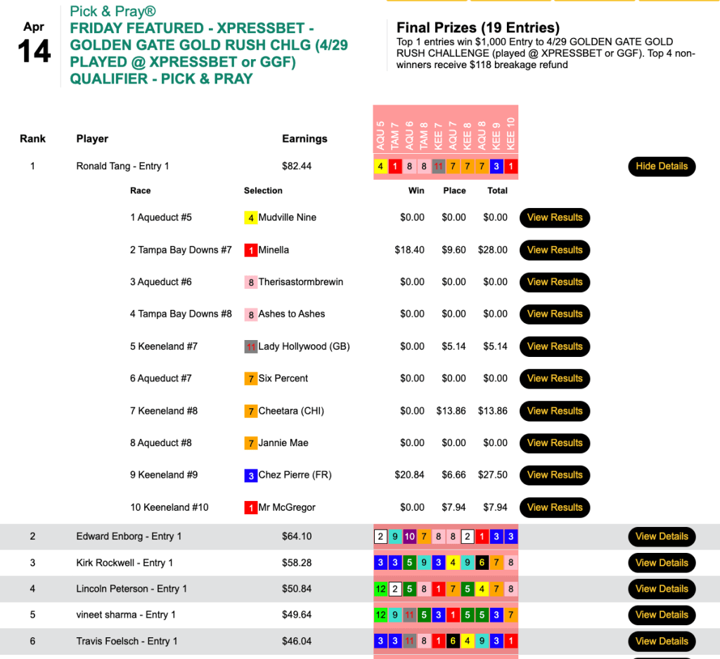 Here, he took the top spot, securing for himself a $1,000 entry—playable at Golden Gate or Xpressbet—on April 29.
