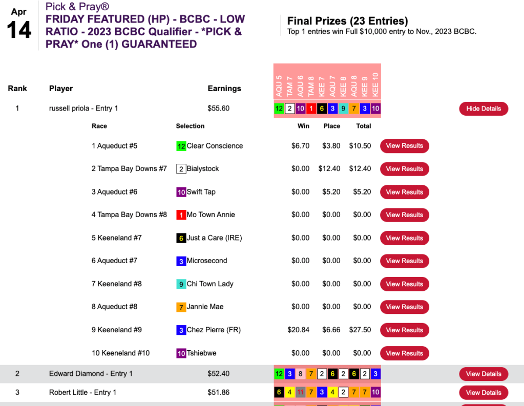 Russell Priola (2 firsts, 2 seconds) got the $10,000 seat in this BCBC Low Ratio Pick & Pray thanks in large part to 9-1 Chez Pierre (who was a lot larger than 9-1 as he entered the Maker’s Mark Mile starting gate).