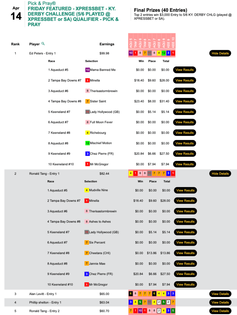 The same selections also enabled Peters to prevail in Friday’s Kentucky Derby Challenge play-in.