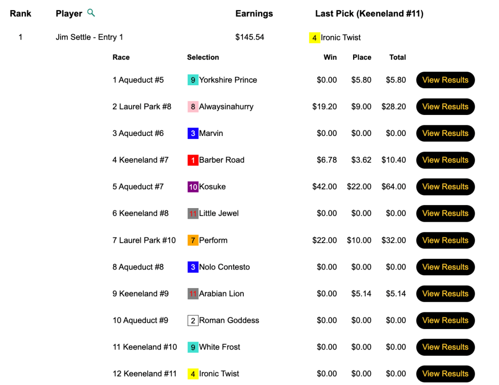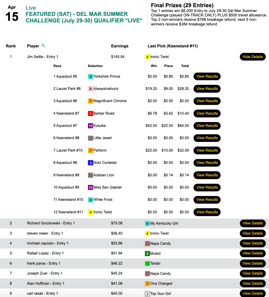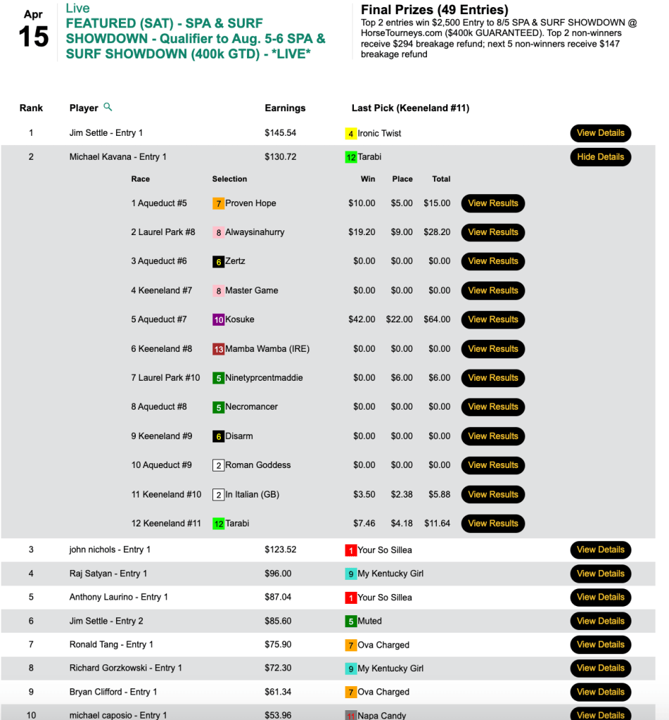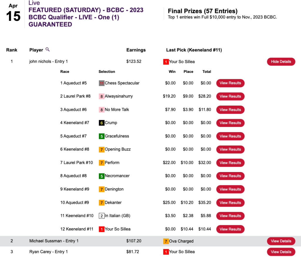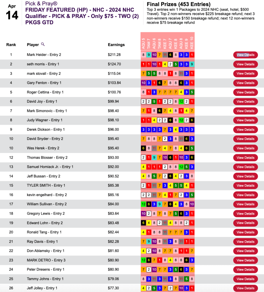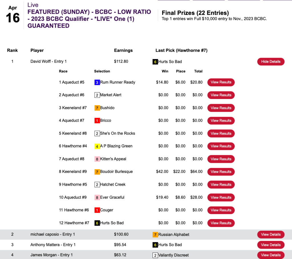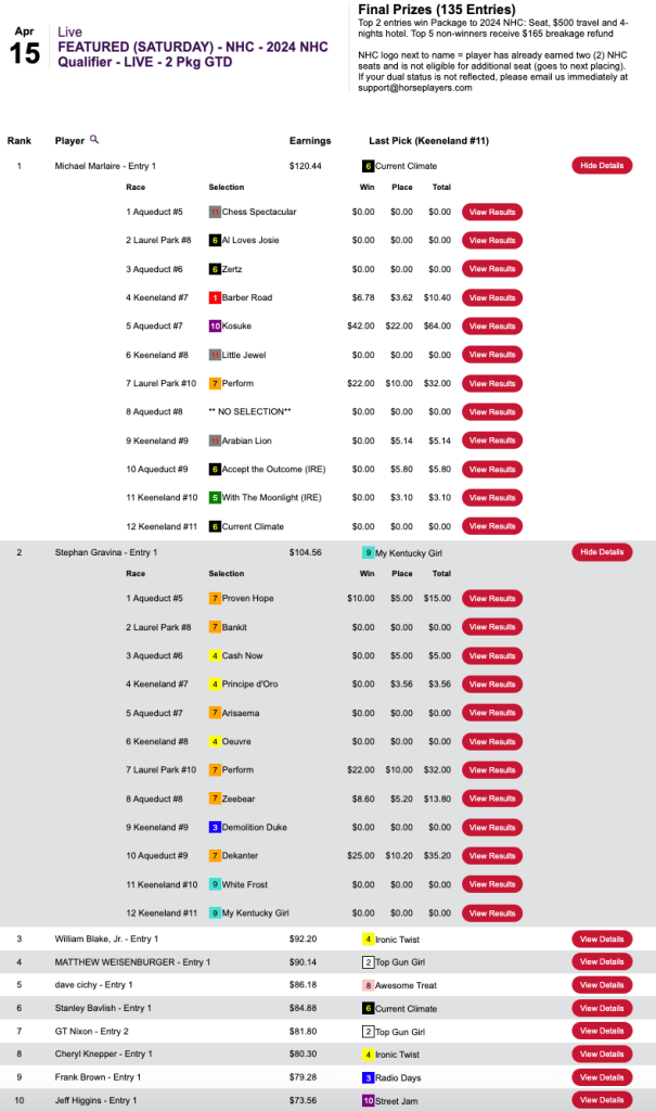 Heider hit two cap horses plus two $20+ winners, and he dominated Friday’s $75 NHC qualifier at HorsePlayers by more than $86.00. (It’s rare that someone wins this particular game by that much given how many players typically enter it.)