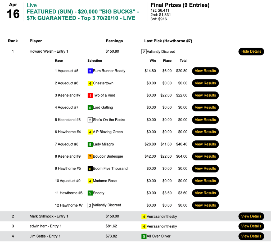 Heider finished with a total of $211.28. Meanwhile, the other Friday feature at HorsePlayers was won with a score of $55.60.
