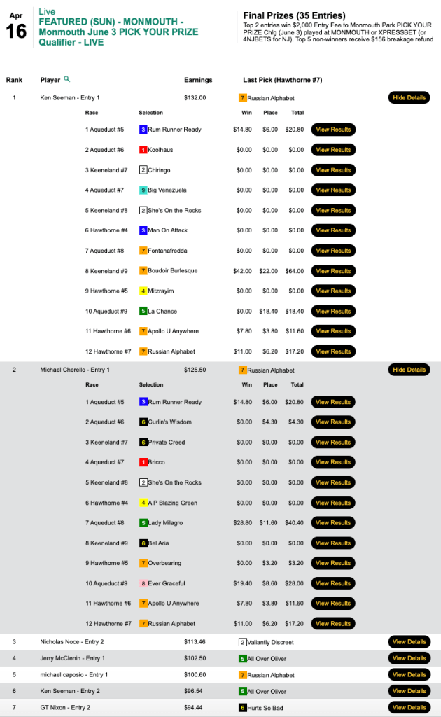 Thanks in part to Mercante, Lynch’s victory in Thursday’s $6,000 Guaranteed Pick & Pray was a unanimous decision—one that earned him the winner’s share of $4,168 in a game ultimately worth a total of $9,262. (It was an 8-race game due to the Thursday cancellation of the Gulfstream card.)