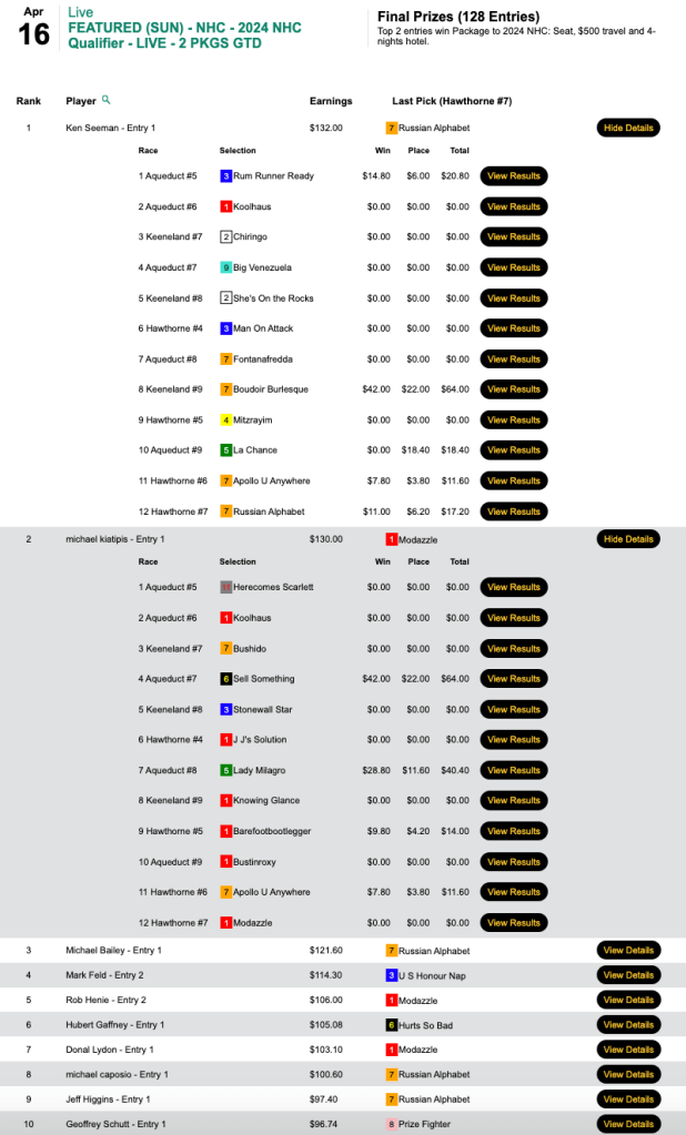 The two to reach triple figures were the two to collect NHC seats in Saturday’s $165 play-in at HorsePlayers.