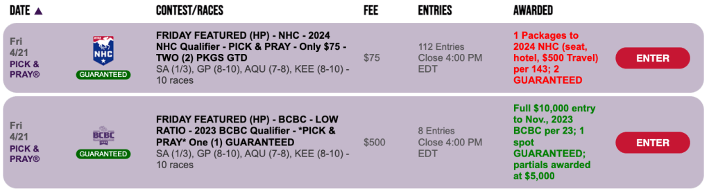 Saturday is the day of our weekly qualifier to the Del Mar Summer…Challenge. The Del Mar event is an on-track-only contest on July 29-30 with an entry fee of $6,000. If you win Saturday’s 1-per-20 Pick & Pray, you’ll earn an entry plus an extra $500 to get yourself to old Del Mar.