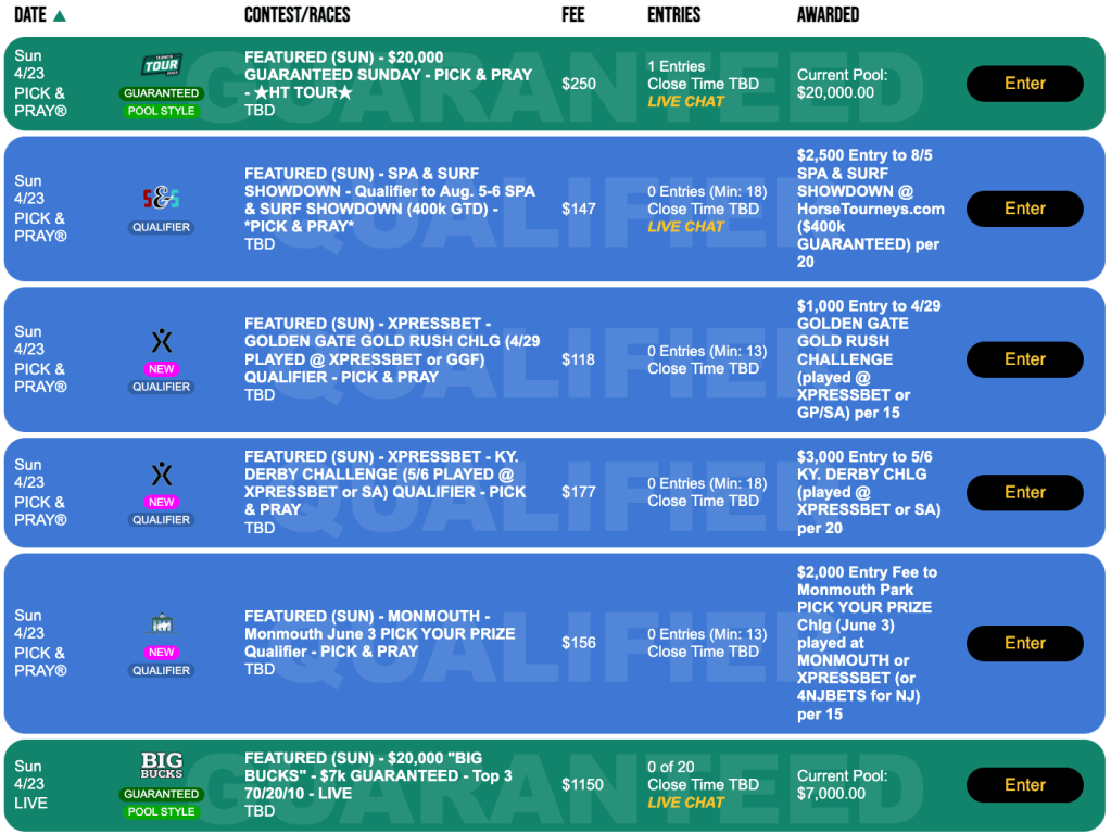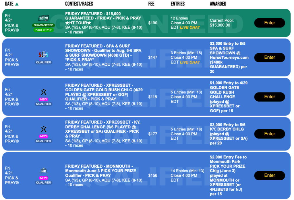 For the third consecutive day, we’ll host Pick & Pray qualifiers to the Golden Gate Gold Rush Challenge, the Kentucky Derby Challenge, the Monmouth Pick Your Prize Challenge and the Spa & Surf Showdown.