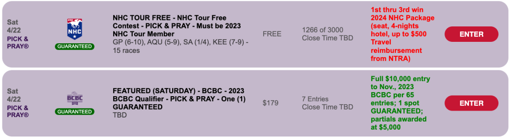 Also on Saturday at HorsePlayers is a Breeders’ Cup Betting Challenge Pick & Pray. It’s $179 to enter, and one $10,000 seat is guaranteed in this 1-per-65 test. Note that this one, like all of the features at HorseTourneys on Saturday, will be a 12-race game (not 15).