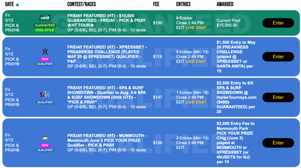 For the second straight day, we’ll have qualifiers to the Preakness Challenge, the Monmouth Pick Your Prize Challenge and the Spa & Surf Showdown. The entry fees and winning ratios are the same as those in place on Friday (and Sunday). All three qualifiers will be run in Live format on Saturday.
