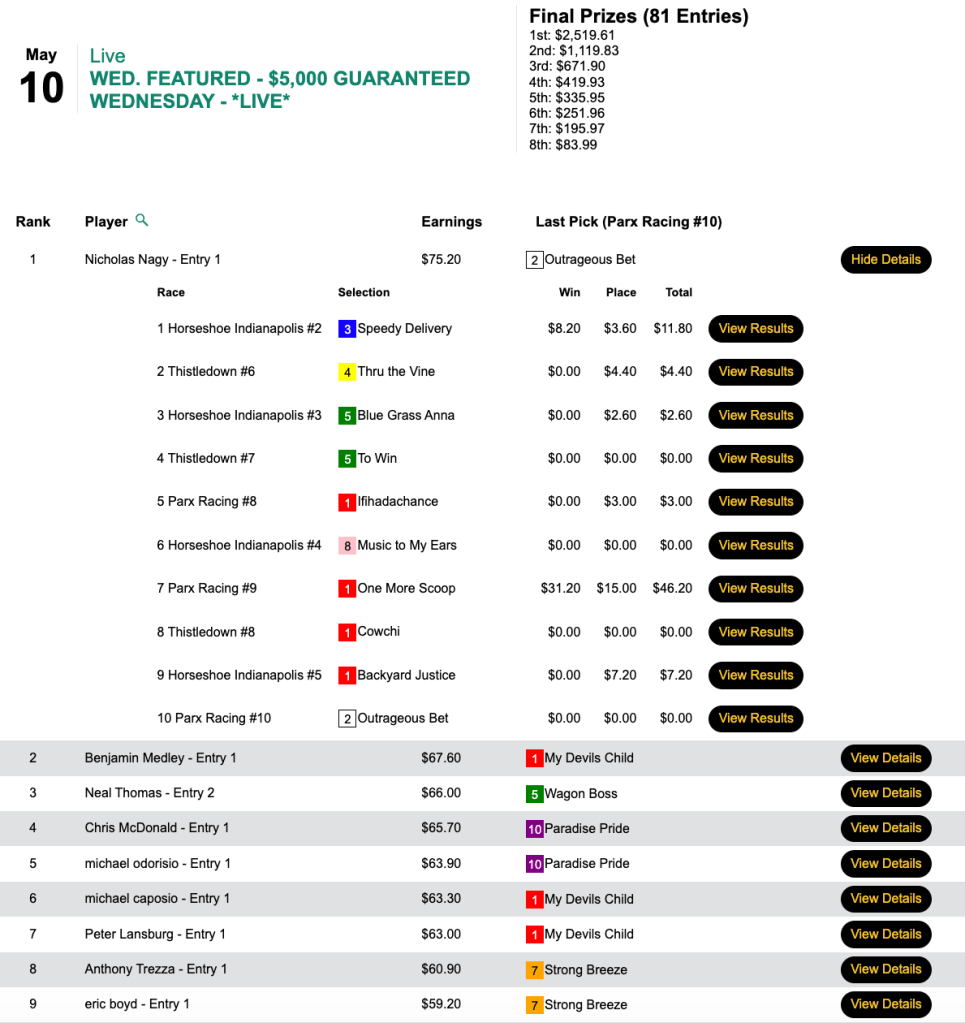 Nicholas Nagy (2 firsts, 4 seconds) had One More Scoop, and he earned $2,519 in Wednesday’s $5,000 Guaranteed cash game, which closed with a purse of $5,599.