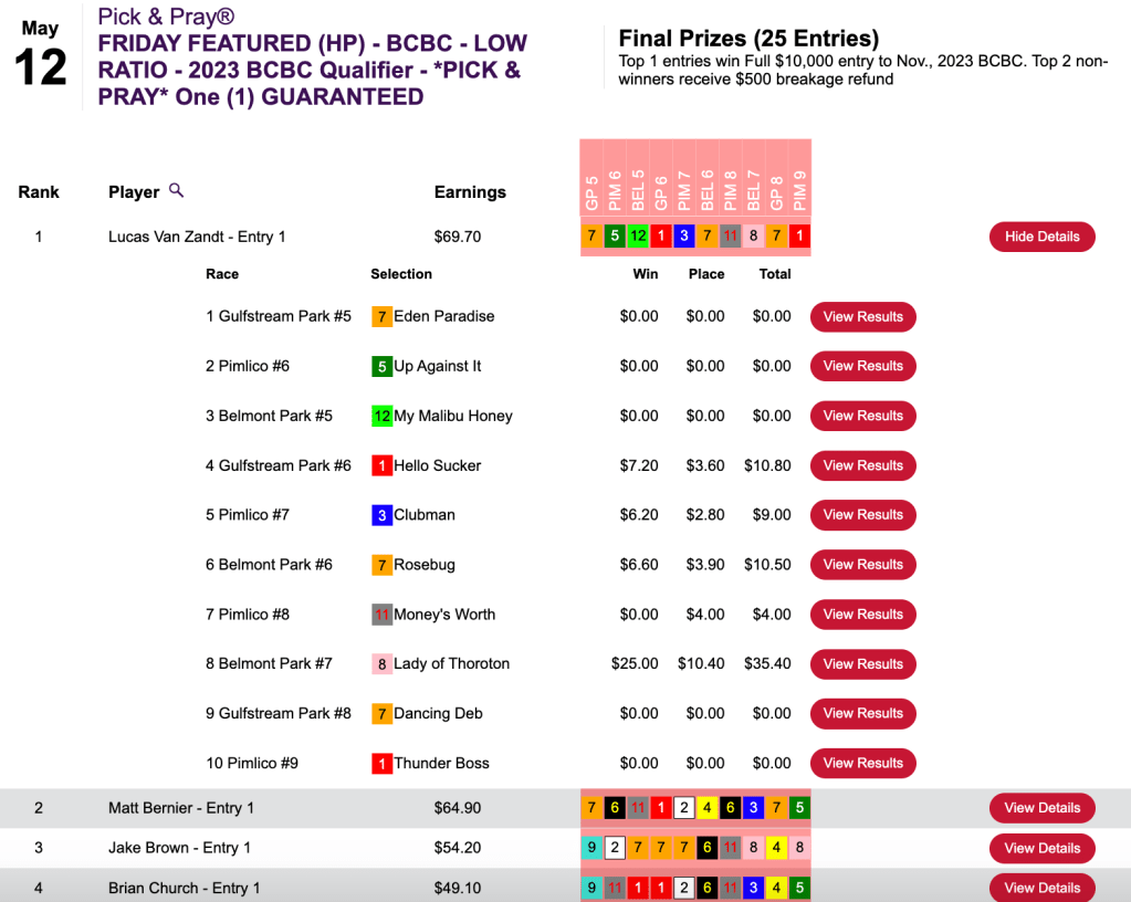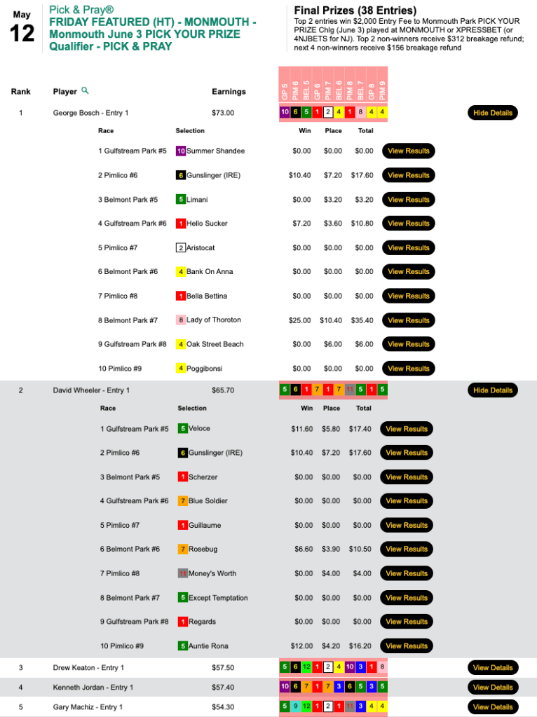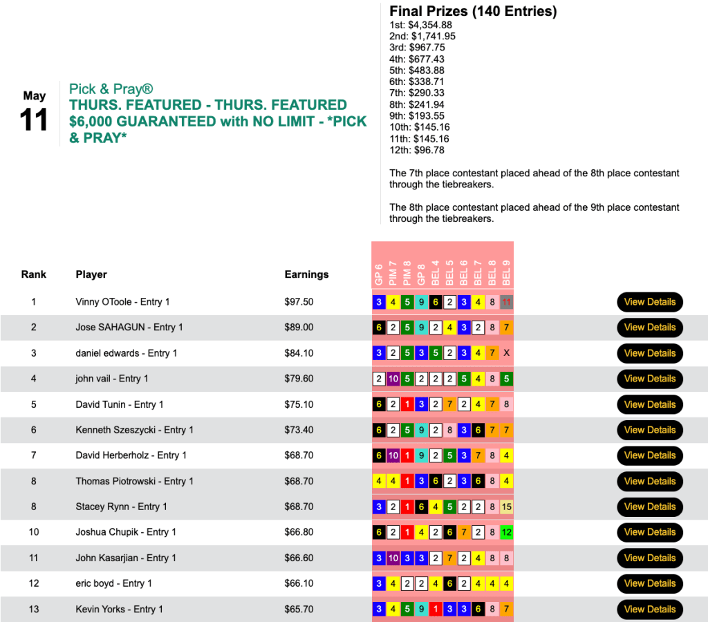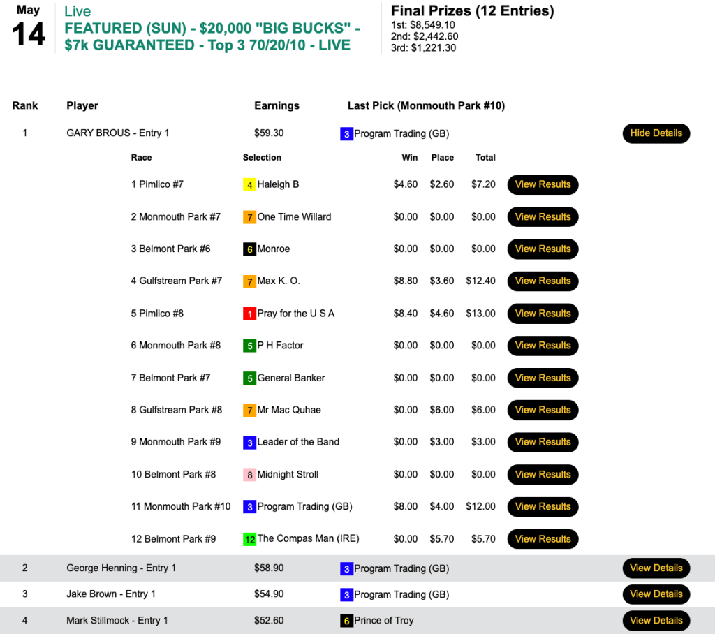 Saturday’s $10,000 Guaranteed Big Bucks tourney was a Pick & Pray—and guess who had Upward Mobility in that one!