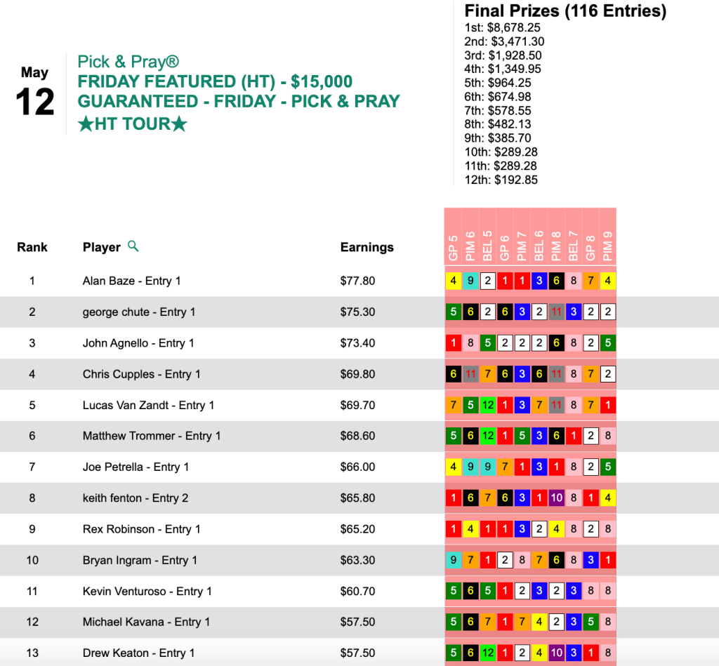 The “Lady” was one of four Baze winners en route to his victory worth $8,678 in Friday’s HT Tour competition, our $15,000 Guaranteed Pick & Pray, which closed its books with $19,285 in the pot.