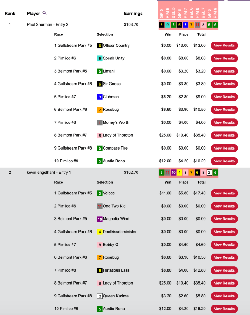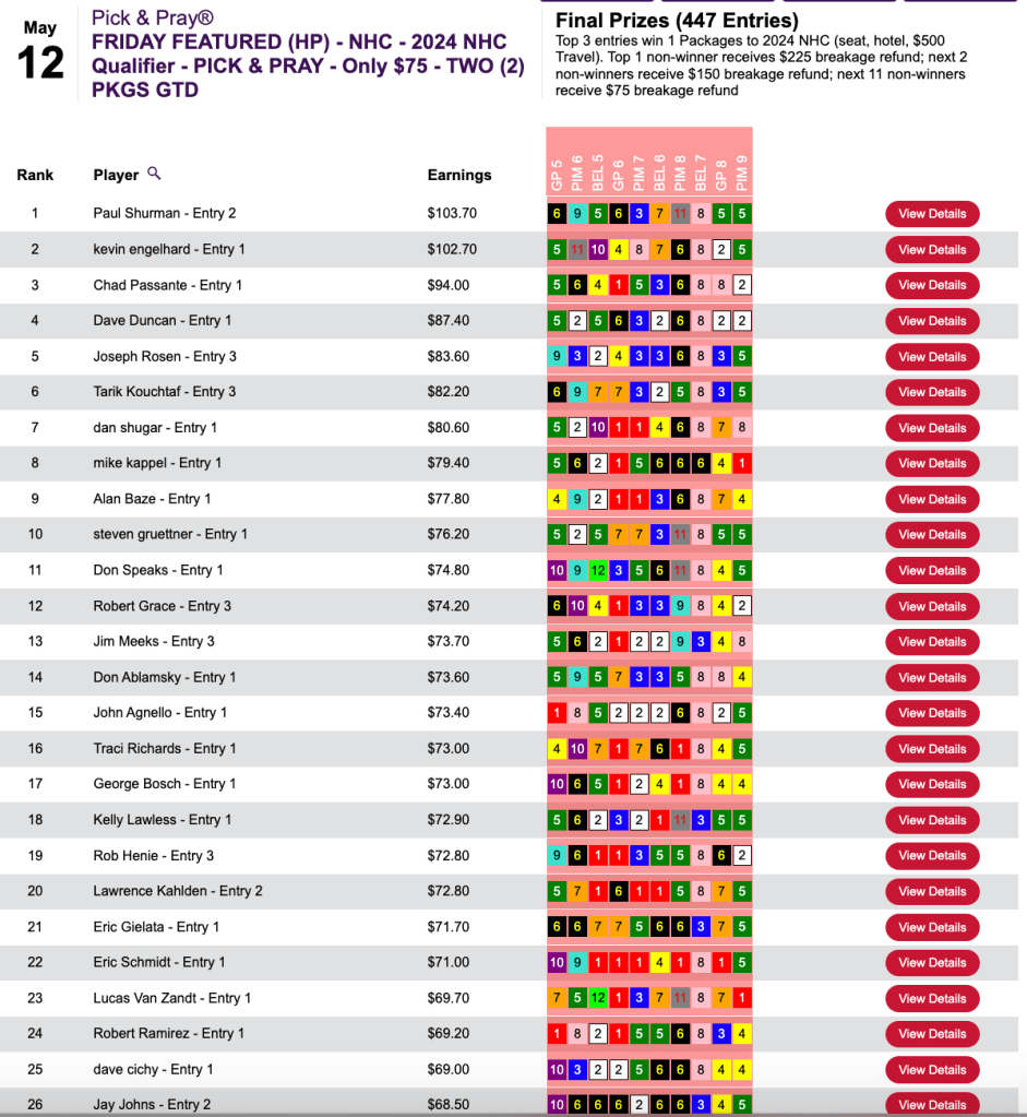 On Friday, Engelhard swept the final five contest races to finish with 6 firsts and 1 second on the day. That allowed him to best all but NHC Hall of Famer Paul Shurman (4 firsts, 5 seconds) in the always-tough-to-win $75 NHC qualifier at HorsePlayers.