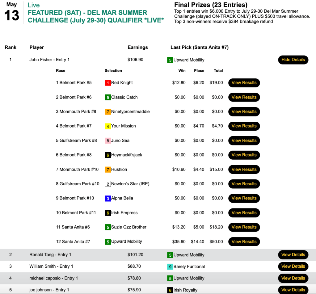 Derek Isenberg got the up-top money of $13,500. Obviously, he had Upward Mobility, which sent him from 6th to 1st at the end. He also selected 3 other winners and 3 runners up.