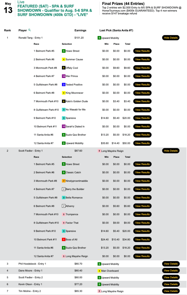 We already mentioned that Dr. Ron Tang picked up a Preakness Challenge entry on Saturday for finishing second to George Chute. In Saturday’s Spa & Surf Showdown play-in, Tang was on the top step of the victory stand thanks to a 3-win, 2-place performance that included Upward Mobility ($35.60, $14.40) in the final contest race, the 7th at Santa Anita. The second Spa & Surf Showdown seat in this qualifier was earned by Scott Fiedler who won the 2020 edition of the Spa & Surf.