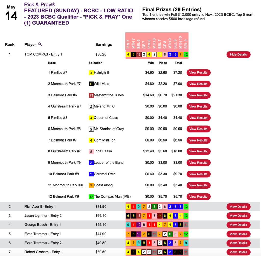 Here at HorseTourneys, the Sunday HT Tour game was our $20,000 Guaranteed Pick & Pray.