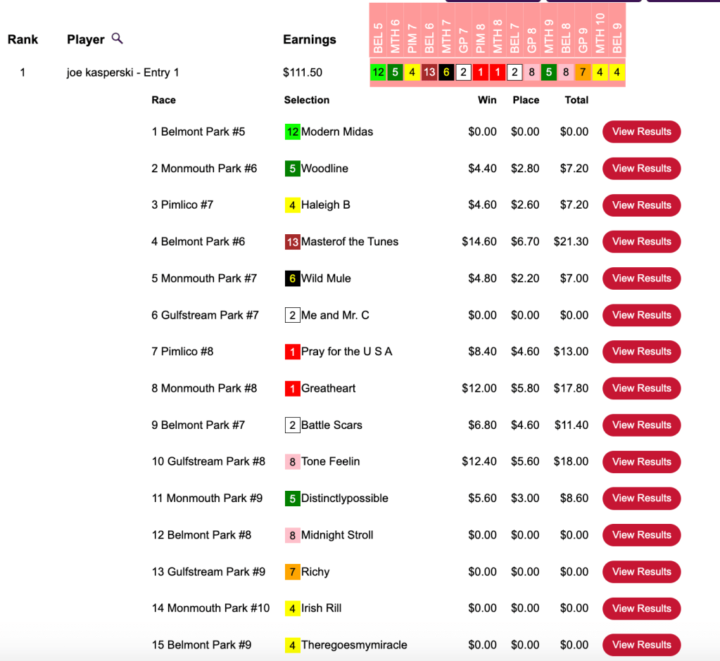 Ken Kieras (4 firsts, 1 second) was the winner of the $1,000 entry thanks in no small part to having top price of the day Masterof the Tunes ($14.60, $6.70) in race 6 at Belmont and a $5.70 place payoff with The Compas Man in race 10 at Belmont.