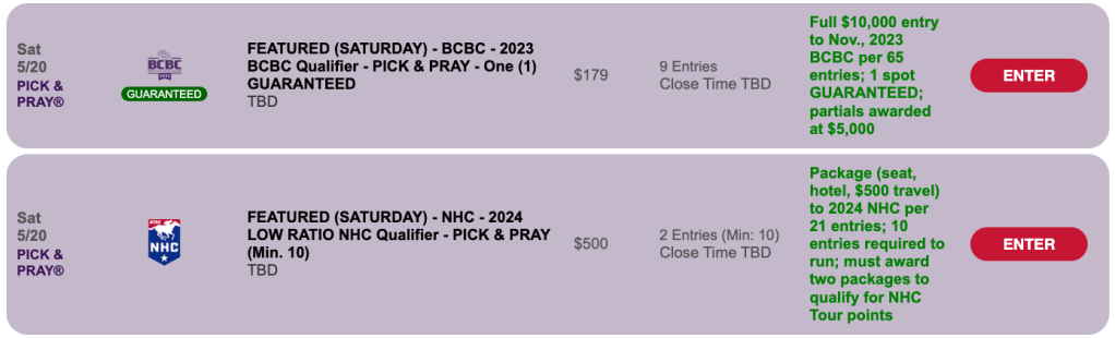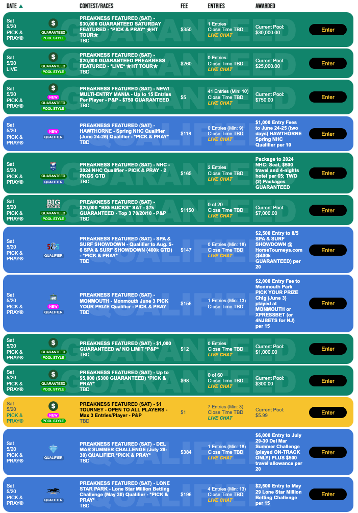 On Preakness day, we have both Live and Pick & Pray cash features (plus the Big Bucks game too) on tap, and there will be two NHC qualifiers, including a rare Low Ratio play-in.