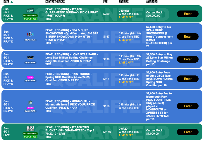 Two Pick & Pray qualifiers share the Sunday featured-tourney spotlight at HorsePlayers.