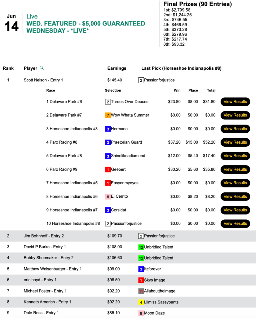 Nelson came up with the four highest priced winners of the day en route to his gaudy 10-race total of $145.40, and he did that over the course of the first six races. Nelson played defense from there and still won by plenty, earning $2,799 out of a final purse of $6,221.