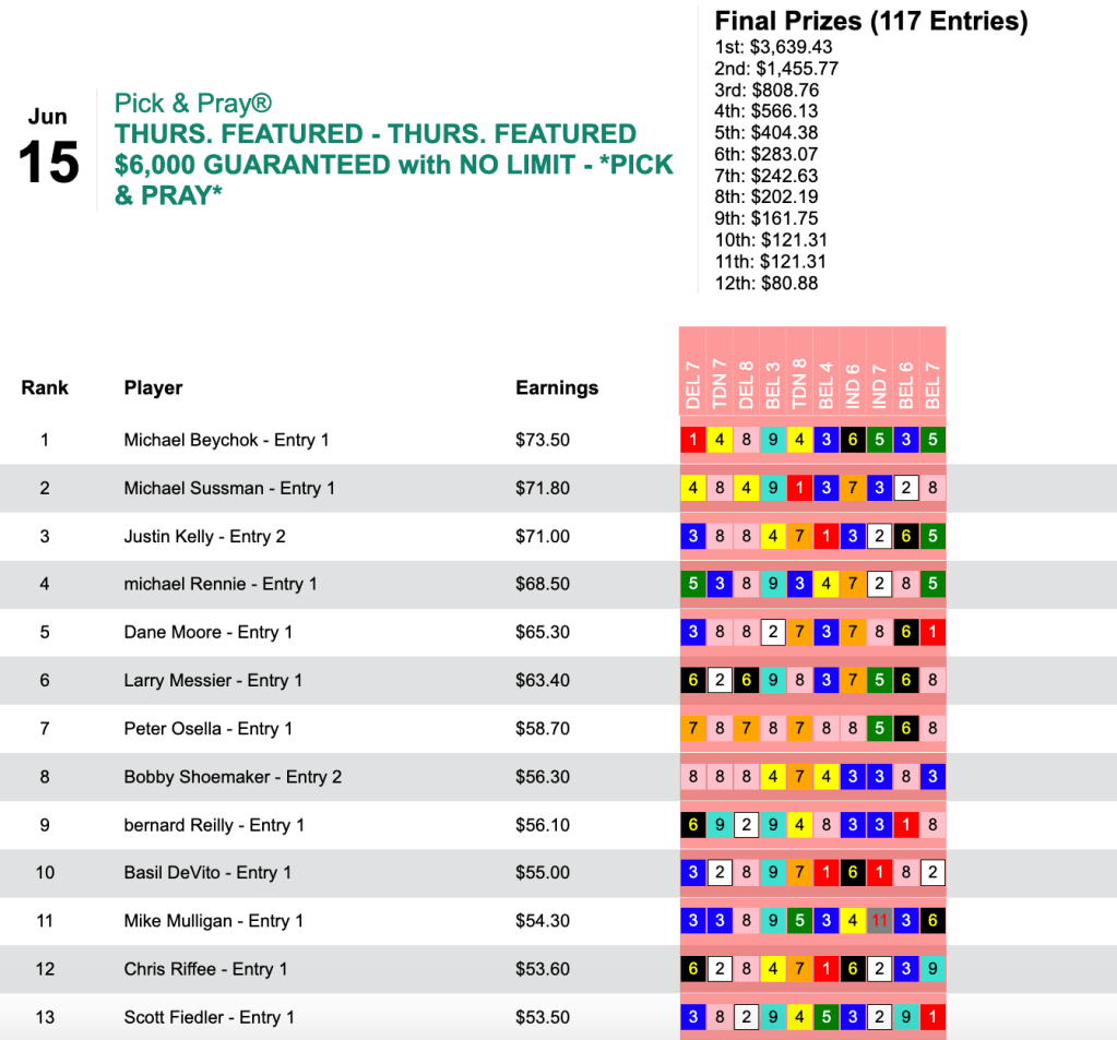 On Thursday, the featured cash tourney was our $6,000 Guaranteed Pick & Pray, and it was won by the Million Dollar Man, Michael Beychok.